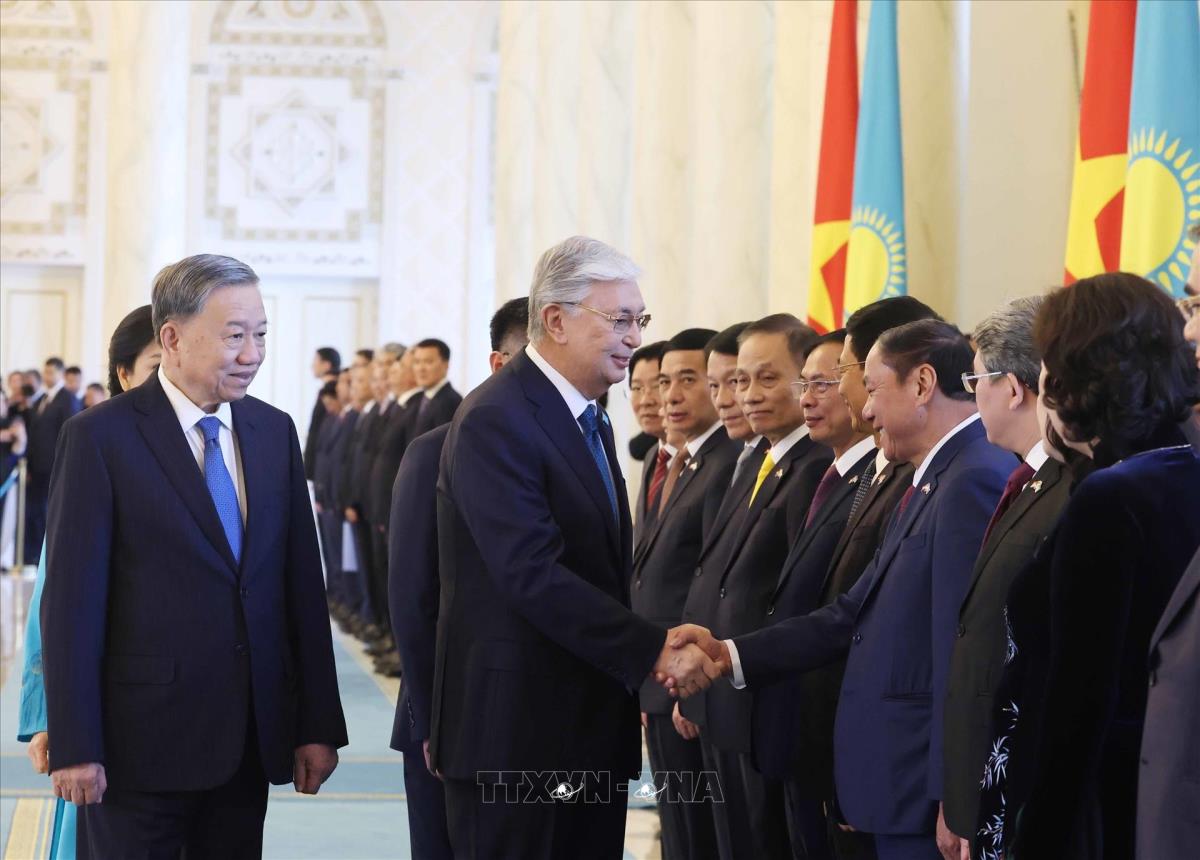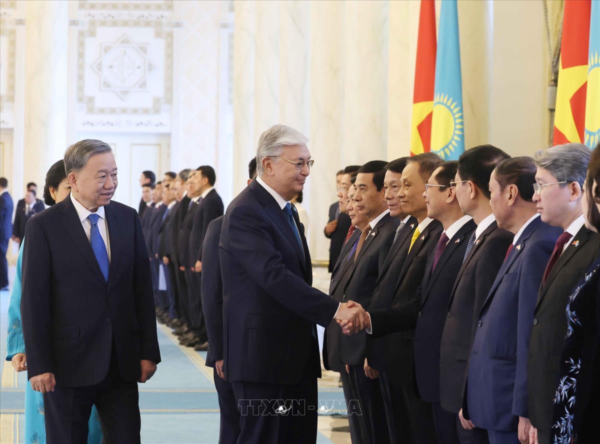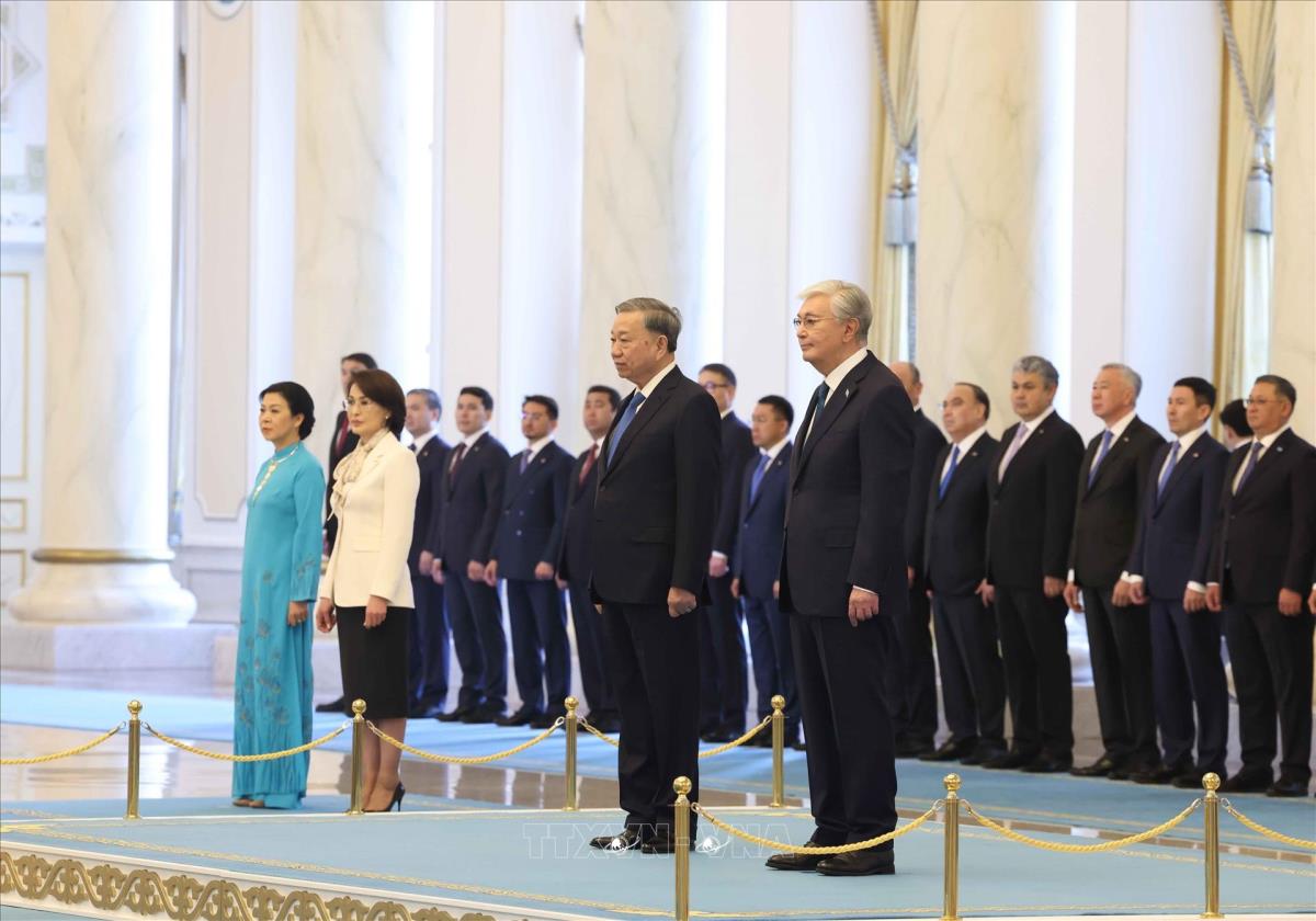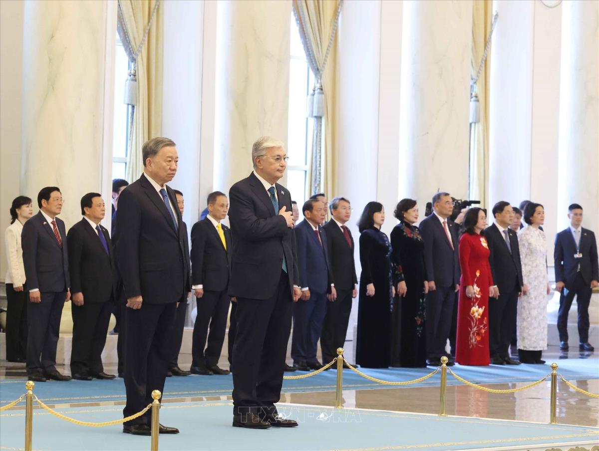 Tổng thống Kazakhstan Kassym-Jomart Tokayev chủ trì lễ đón chính thức Tổng Bí thư Tô Lâm và Phu nhân (6/5/2025). Ảnh: Thống Nhất - TTXVN