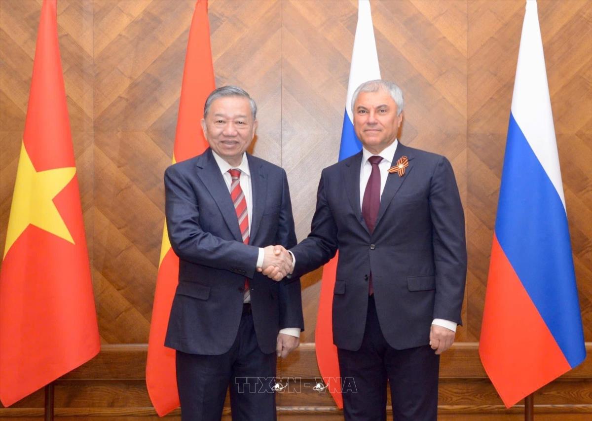 Tổng Bí thư Tô Lâm hội kiến Chủ tịch Duma Quốc gia LB Nga Vyacheslav Volodin (10/5/2025). Ảnh: TTXVN phát