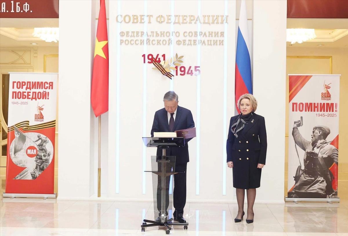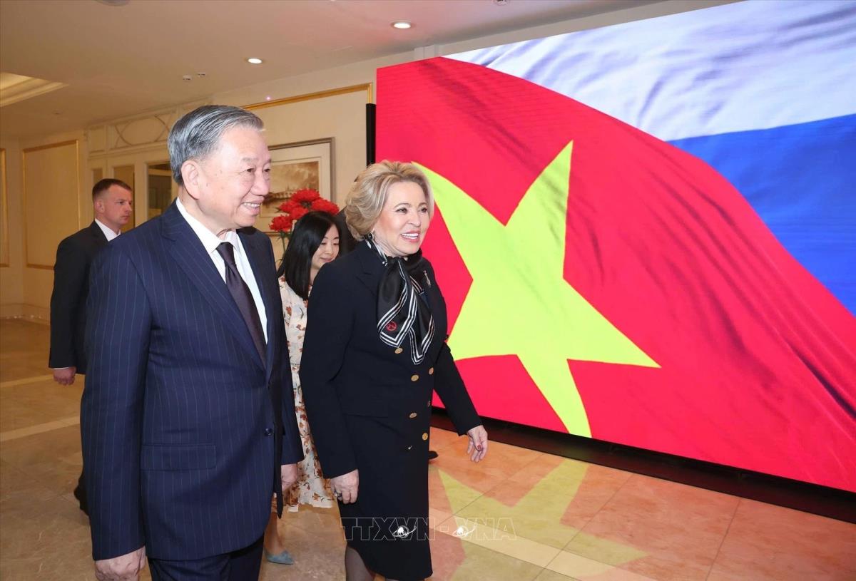 Hà Nội (TTXVN 9/5/2025) Trong chương trình thăm chính thức Liên bang Nga và dự Lễ kỷ niệm 80 năm Ngày Chiến thắng trong chiến tranh Vệ quốc vĩ đại, chiều 9/5/2025, tại thủ đô Moskva, Tổng Bí thư Tô Lâm hội kiến Chủ tịch Hội đồng Liên bang, Quốc hội LB Nga Valentina Matviyenko.