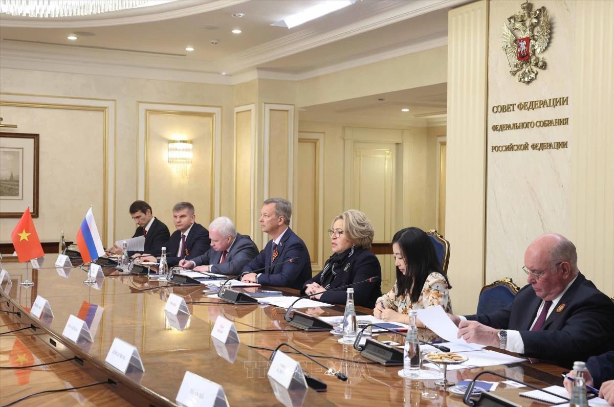 Chủ tịch Hội đồng Liên bang Valentina Matviyenko và đoàn Liên bang Nga tại cuộc hội kiến Tổng Bí thư Tô Lâm (9/5/2025). Ảnh: Thống Nhất – TTXVN