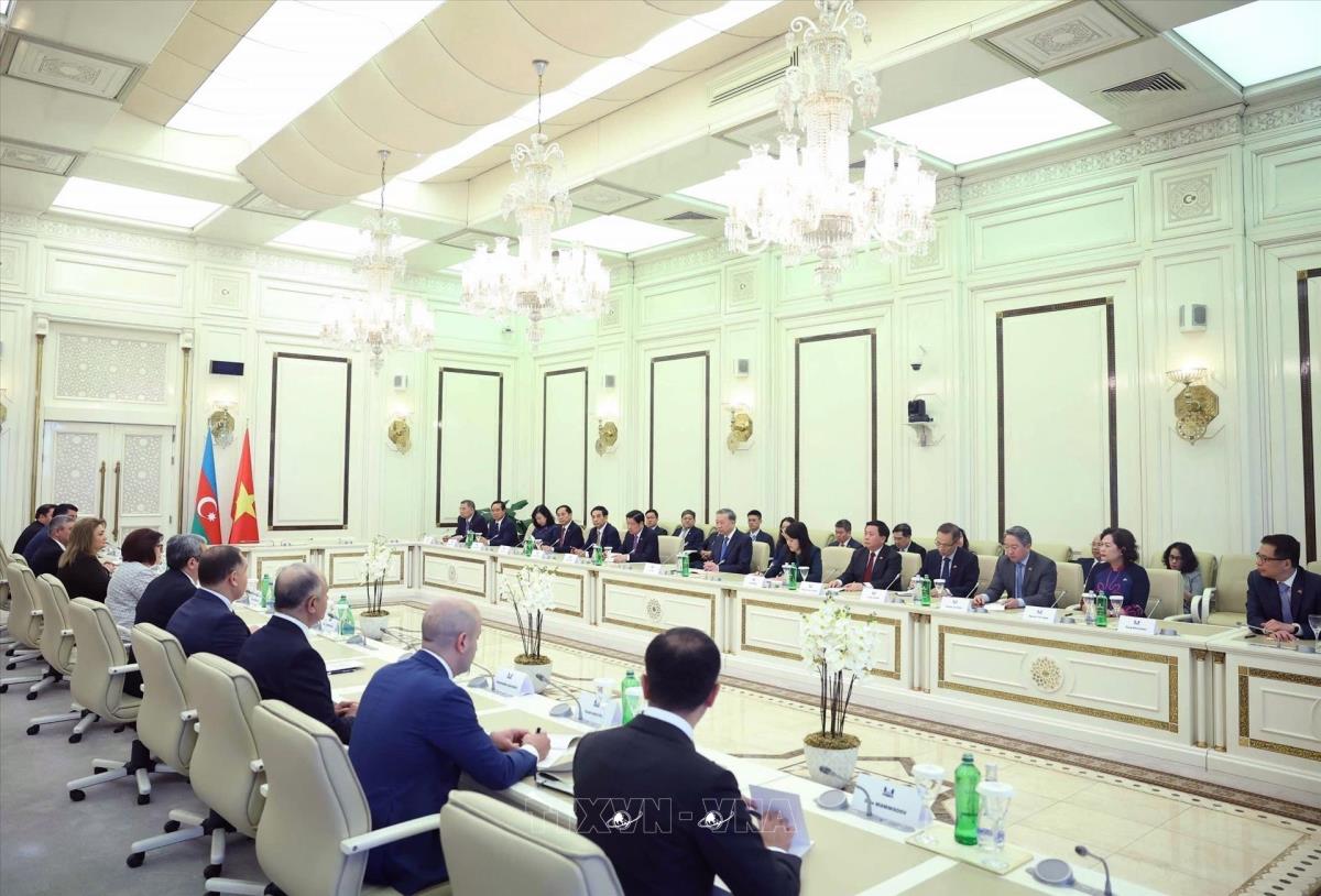 Tổng Bí thư Tô Lâm và đoàn Việt Nam tại cuộc hội kiến Chủ tịch Quốc hội Azerbaijan Sahiba Gafarova (8/5/2025). Ảnh: Thống Nhất – TTXVN