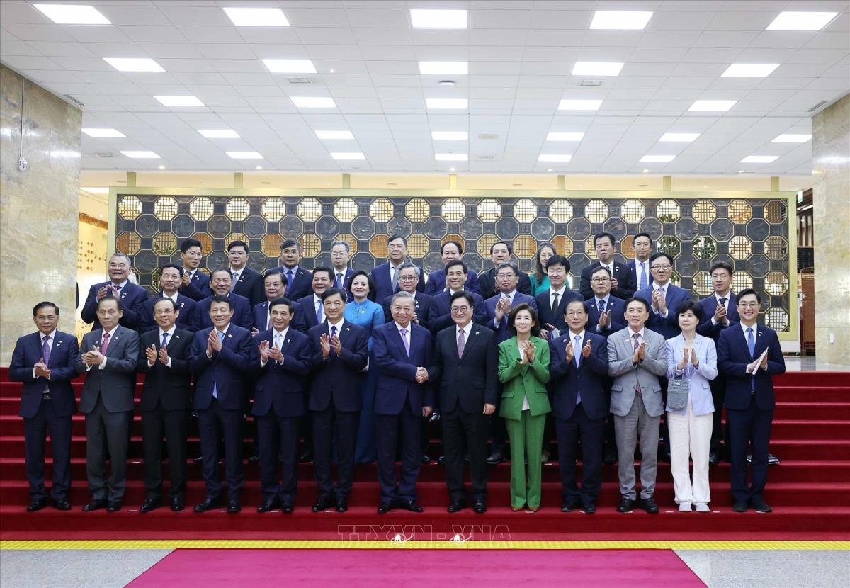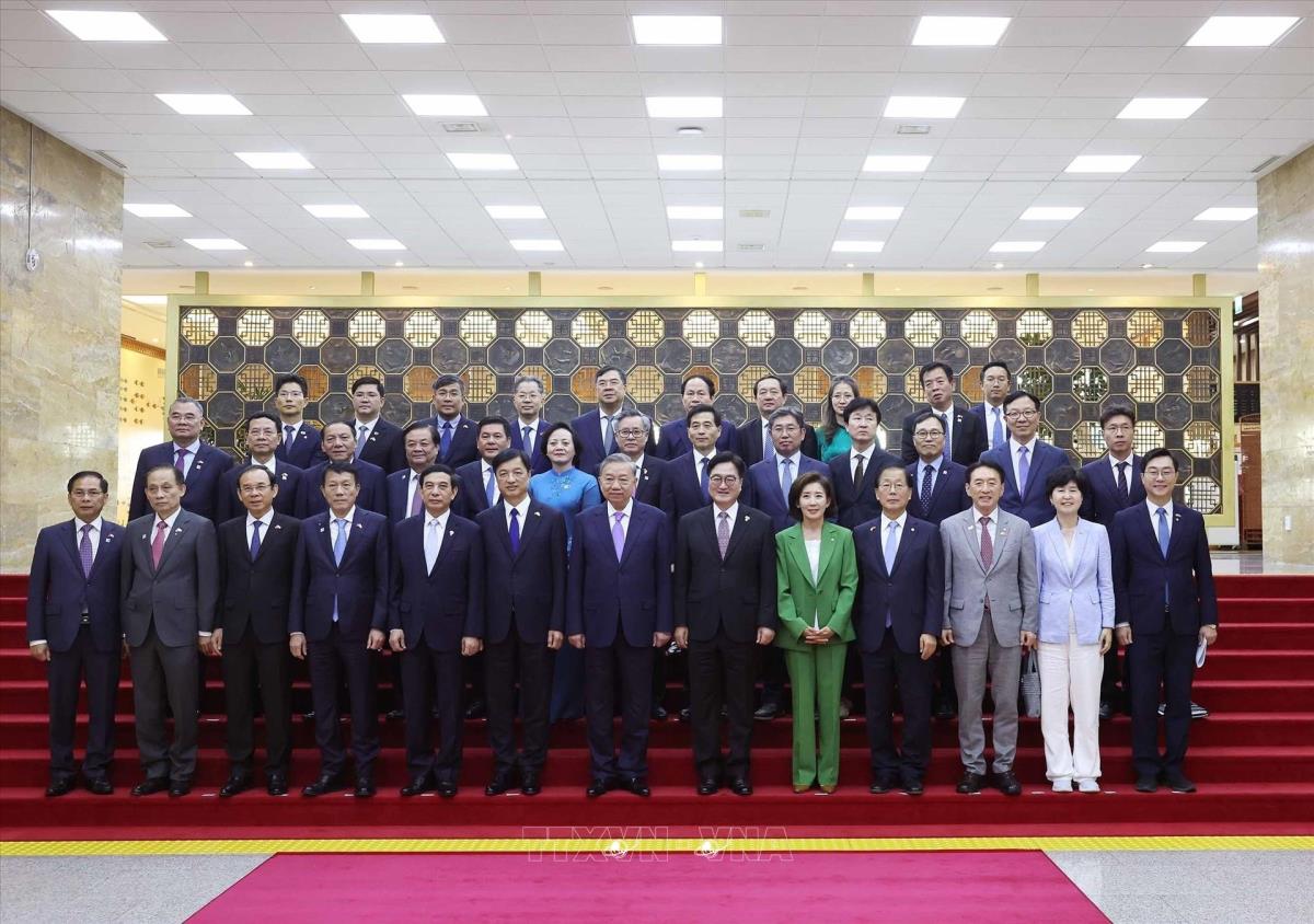 Tổng Bí thư Tô Lâm cùng Chủ tịch Quốc hội Hàn Quốc Woo Won Sik và các đại biểu chụp ảnh chung (12/8/2025). Ảnh: Thống Nhất – TTXVN
