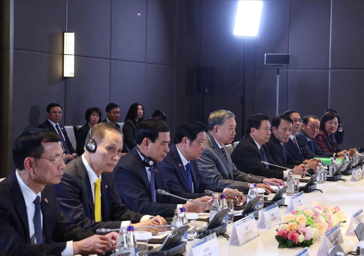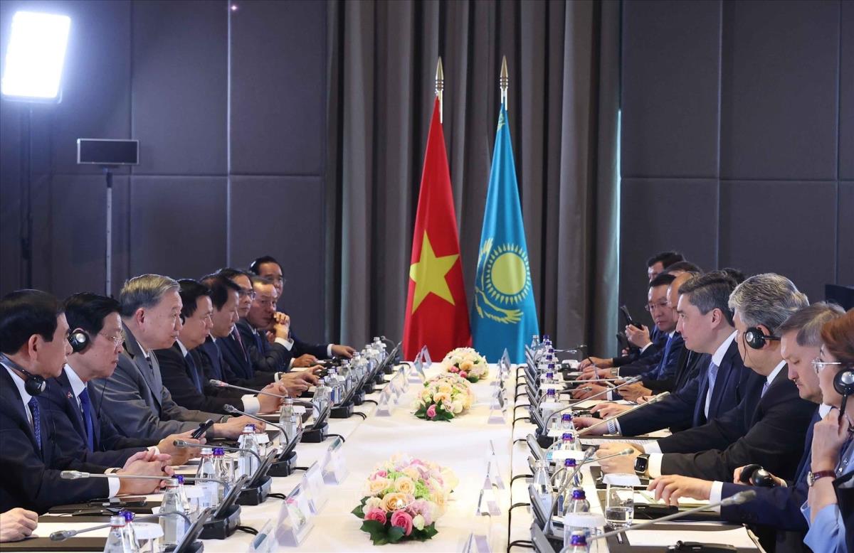 Tổng Bí thư Tô Lâm và thành viên đoàn Việt Nam tại cuộc hội kiến Thủ tướng Kazakhstan Olzhas Bektenov (6/5/2025). Ảnh: Thống Nhất – TTXVN