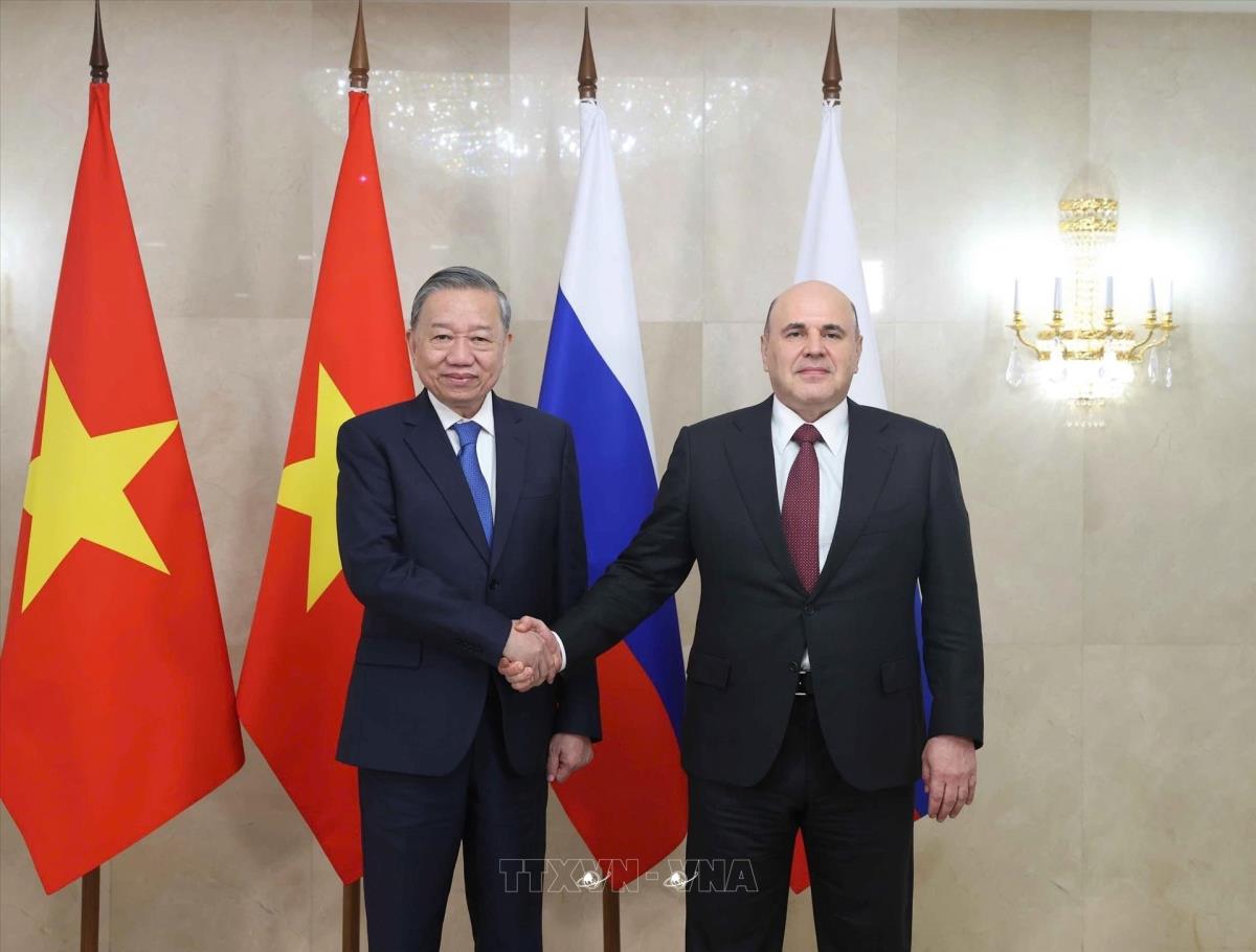 [Photo] Tổng Bí thư Tô Lâm hội kiến Thủ tướng LB Nga