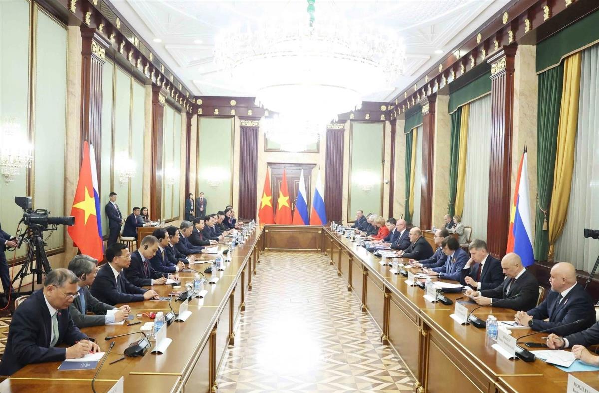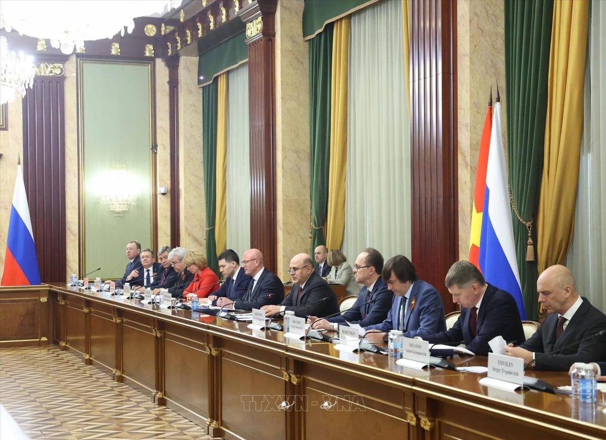 Thủ tướng Mikhail Mishustin và đoàn Chính phủ Liên bang Nga tại cuộc hội kiến Tổng Bí thư Tô Lâm (8/5/2025). Ảnh: Thống Nhất – TTXVN