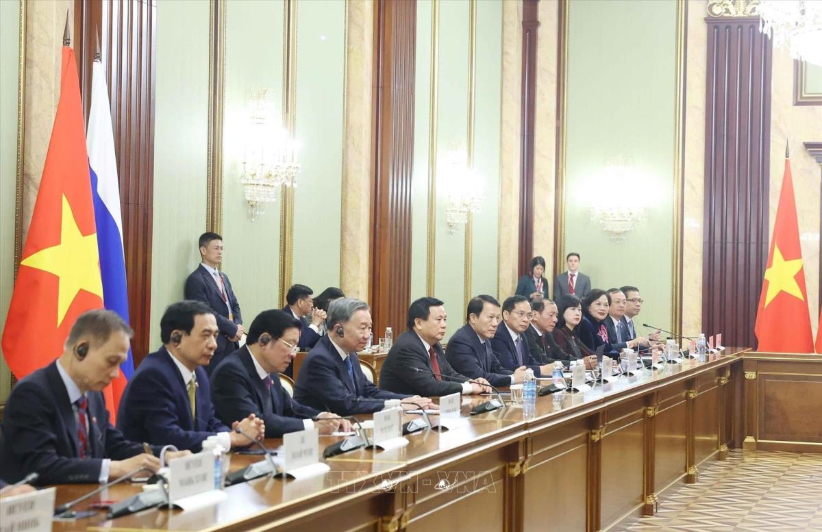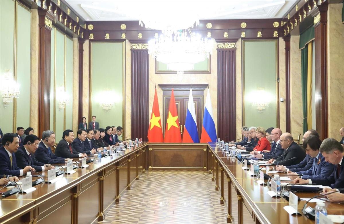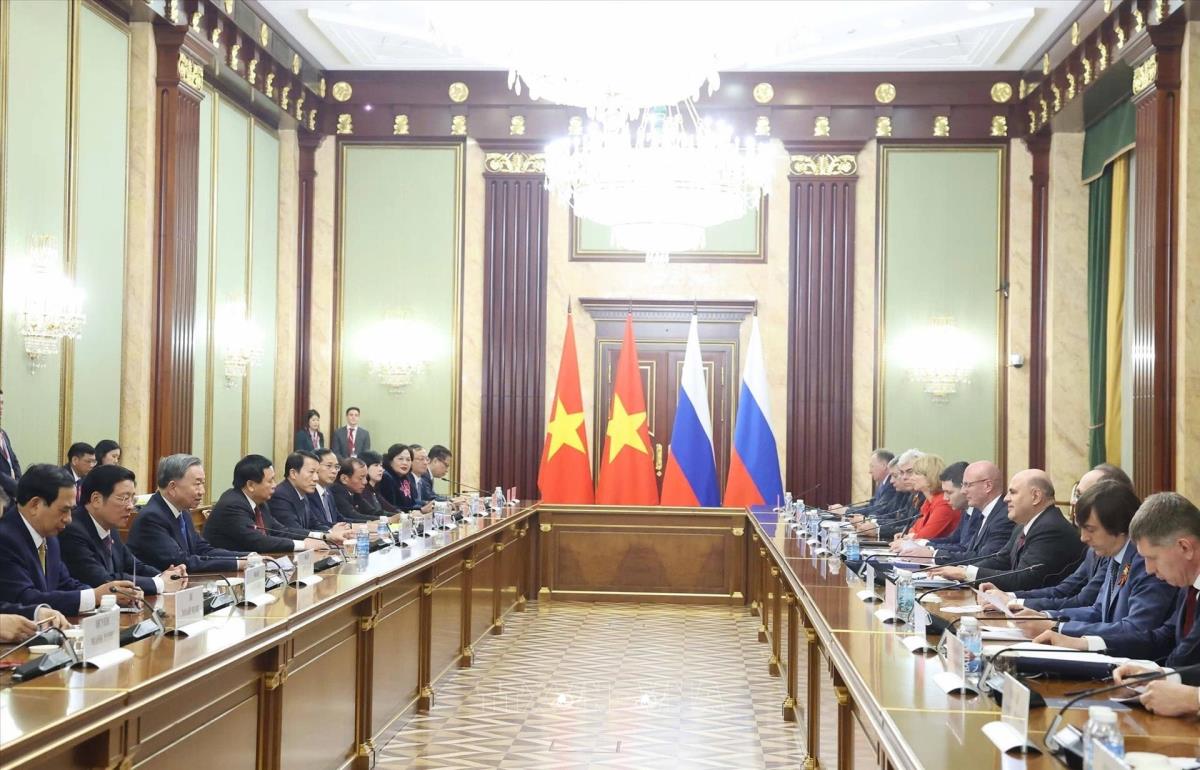 Tổng Bí thư Tô Lâm và đoàn Việt Nam tại cuộc hội kiến Thủ tướng Liên bang Nga Mikhail Mishustin (8/5/2025). Ảnh: Thống Nhất – TTXVN