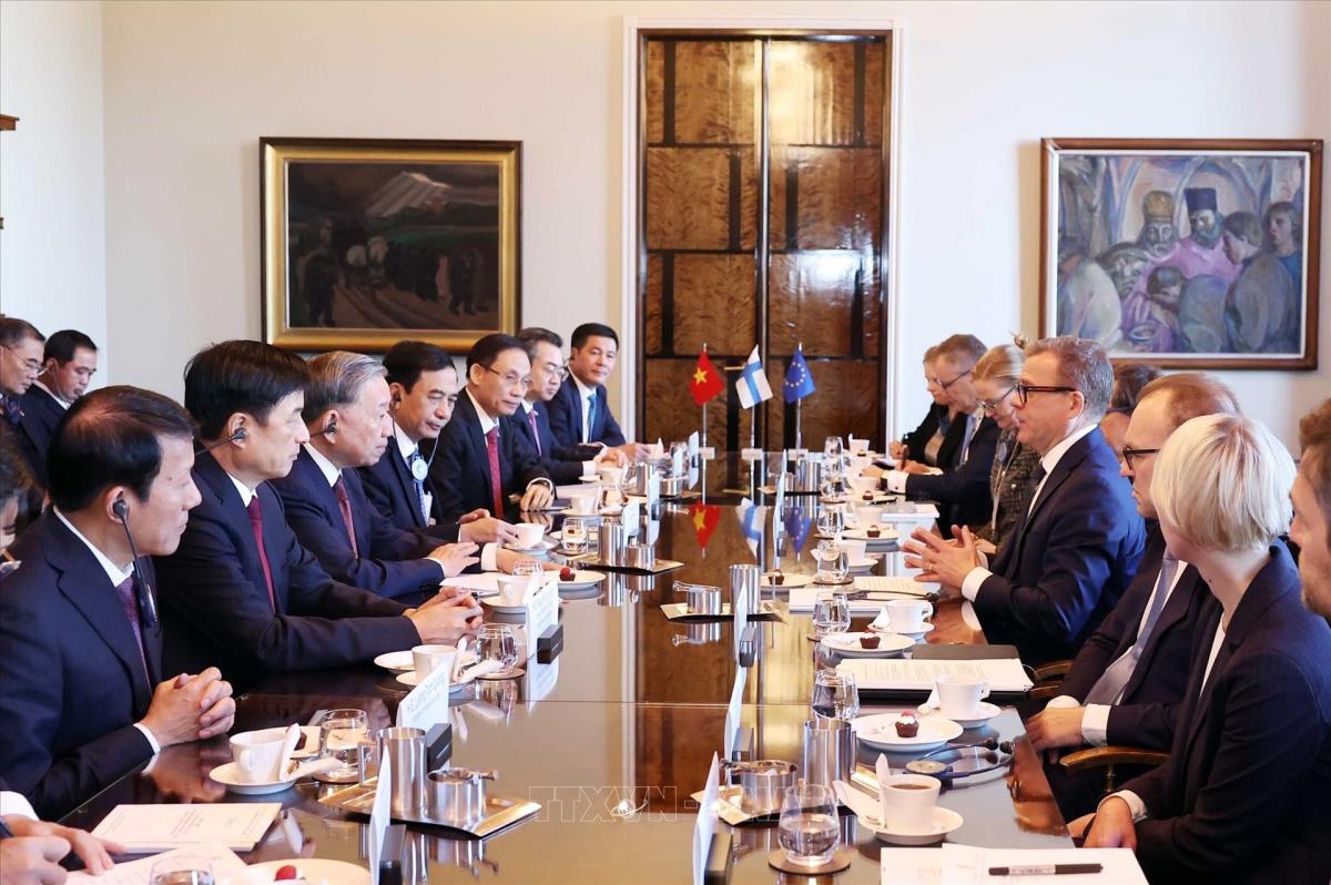 Hà Nội (TTXVN 21/10/2025) Tiếp tục hoạt động trong chuyến thăm chính thức Phần Lan, chiều 21/10/2025 (giờ địa phương), tại thủ đô Helsinki, Tổng Bí thư Tô Lâm hội kiến Thủ tướng Phần Lan Petteri Orpo.