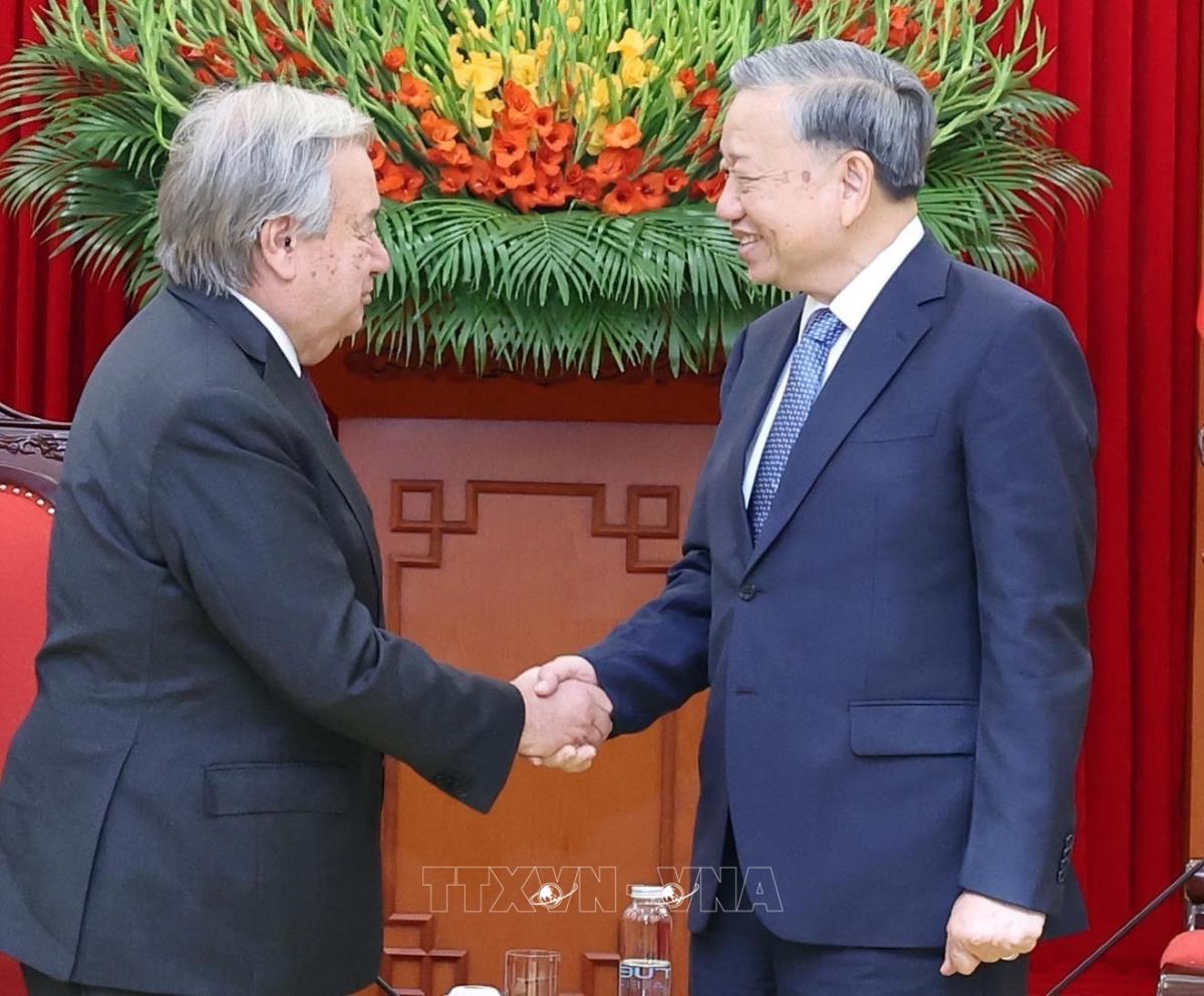 Hà Nội (TTXVN 25/10/2025) Sáng 25/10/2025, tại Trụ sở Trung ương Đảng, Tổng Bí thư Tô Lâm hội kiến Tổng Thư ký Liên hợp quốc António Guterres thăm chính thức Việt Nam và tham dự Lễ mở ký Công ước Liên hợp quốc về chống tội phạm mạng.
