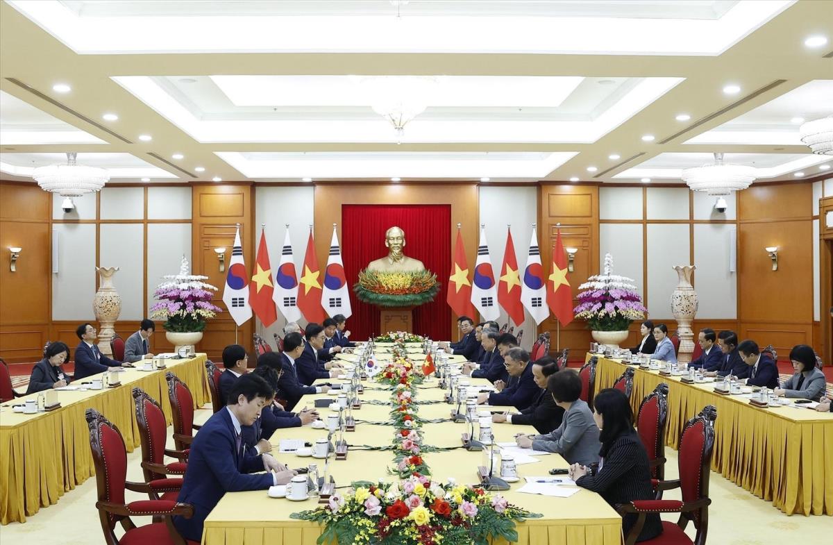 Tổng Bí thư Tô Lâm bày tỏ vui mừng về kết quả cuộc hội đàm rất thành công giữa Chủ tịch Quốc hội Trần Thanh Mẫn và Chủ tịch Quốc hội Woo Won Shik; mong muốn cơ quan lập pháp hai nước tiếp tục phát huy vai trò thúc đẩy gắn kết hợp tác kinh tế hai nước, triển khai nhiều hoạt động giao lưu hợp tác phong phú, góp phần tăng cường tin cậy chính trị và quan hệ giữa các nghị sĩ hai nước; nâng cao hiệu quả hoạt động của Quốc hội, góp phần vào sự phát triển quan hệ Việt - Hàn. Tổng Bí thư đề nghị hai bên tiếp tục mở rộng hợp tác và thường xuyên trao đổi đoàn kênh Đảng, Nhà nước, Chính phủ và Quốc hội, tạo cơ sở mở rộng hợp tác toàn diện trên tất cả các lĩnh vực; kịp thời chia sẻ ý kiến về quan hệ hợp tác giữa hai nước cũng như về tình hình khu vực và quốc tế, qua đó làm sâu sắc hơn quan hệ Đối tác chiến lược toàn diện Việt Nam - Hàn Quốc.