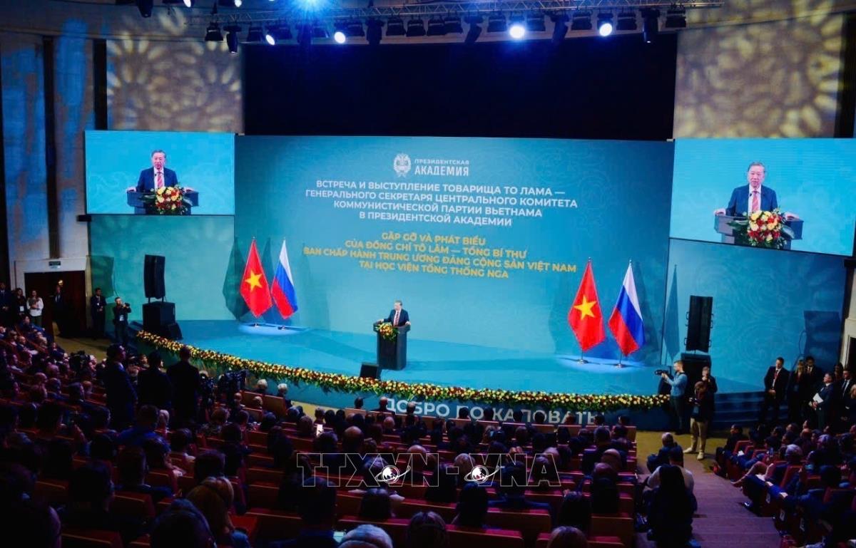 [Photo] Tổng Bí thư Tô Lâm phát biểu Chính sách tại Học viện Hành chính Công và Kinh tế quốc dân Nga