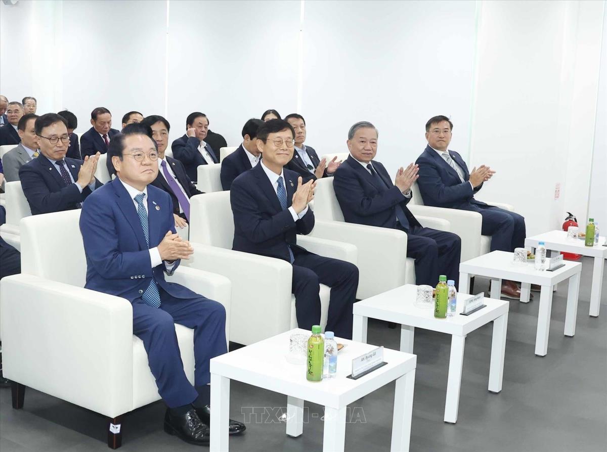 Tổng Bí thư Tô Lâm và các đại biểu trong buổi đến thăm, làm việc tại cảng tự động hoá DGT, Busan, Hàn Quốc (13/8/2025). Ảnh: Thống Nhất – TTXVN