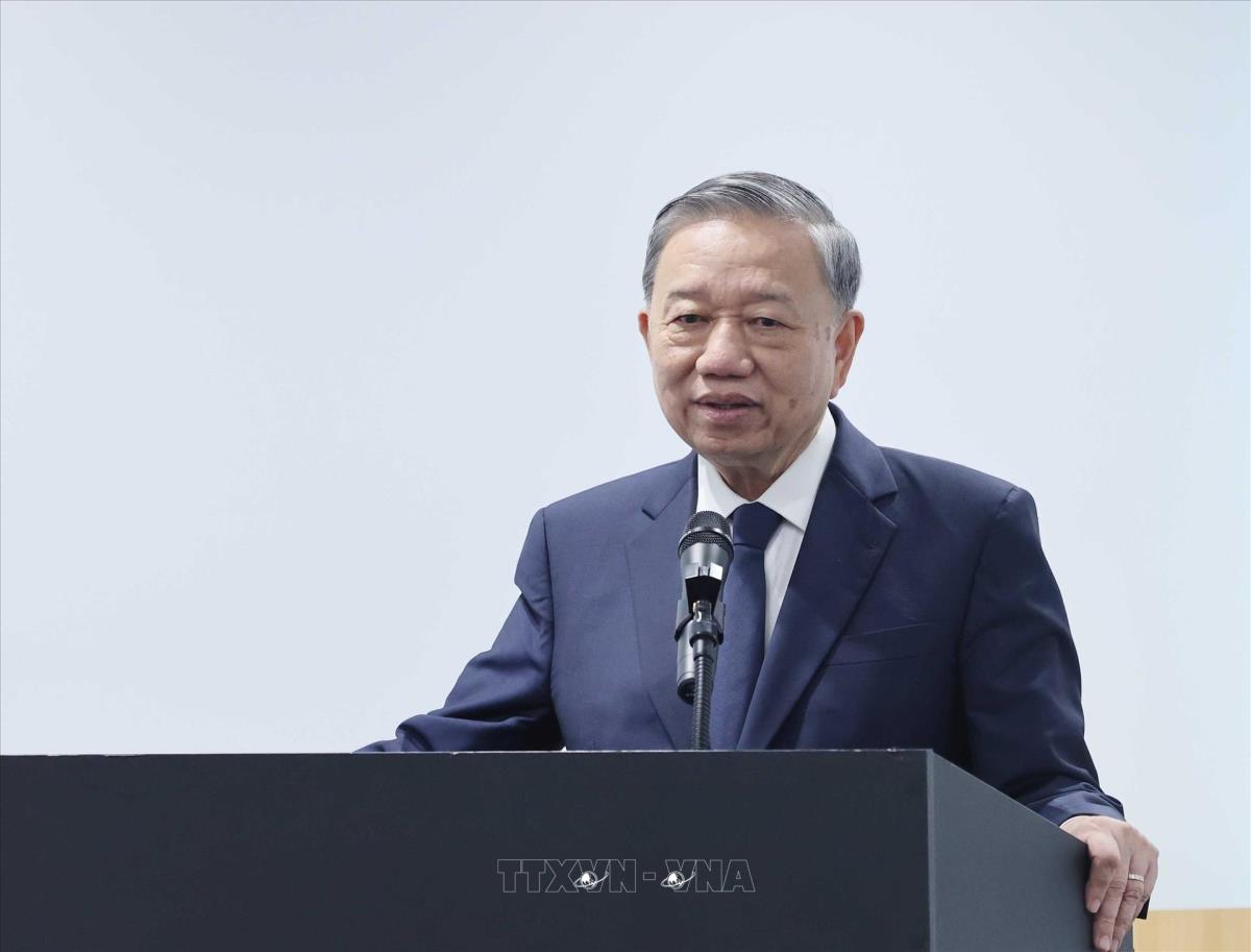 Tổng Bí thư Tô Lâm phát biểu tại buổi đến thăm cảng tự động hoá DGT, thành phố Busan (13/8/2025). Ảnh: Thống Nhất – TTXVN