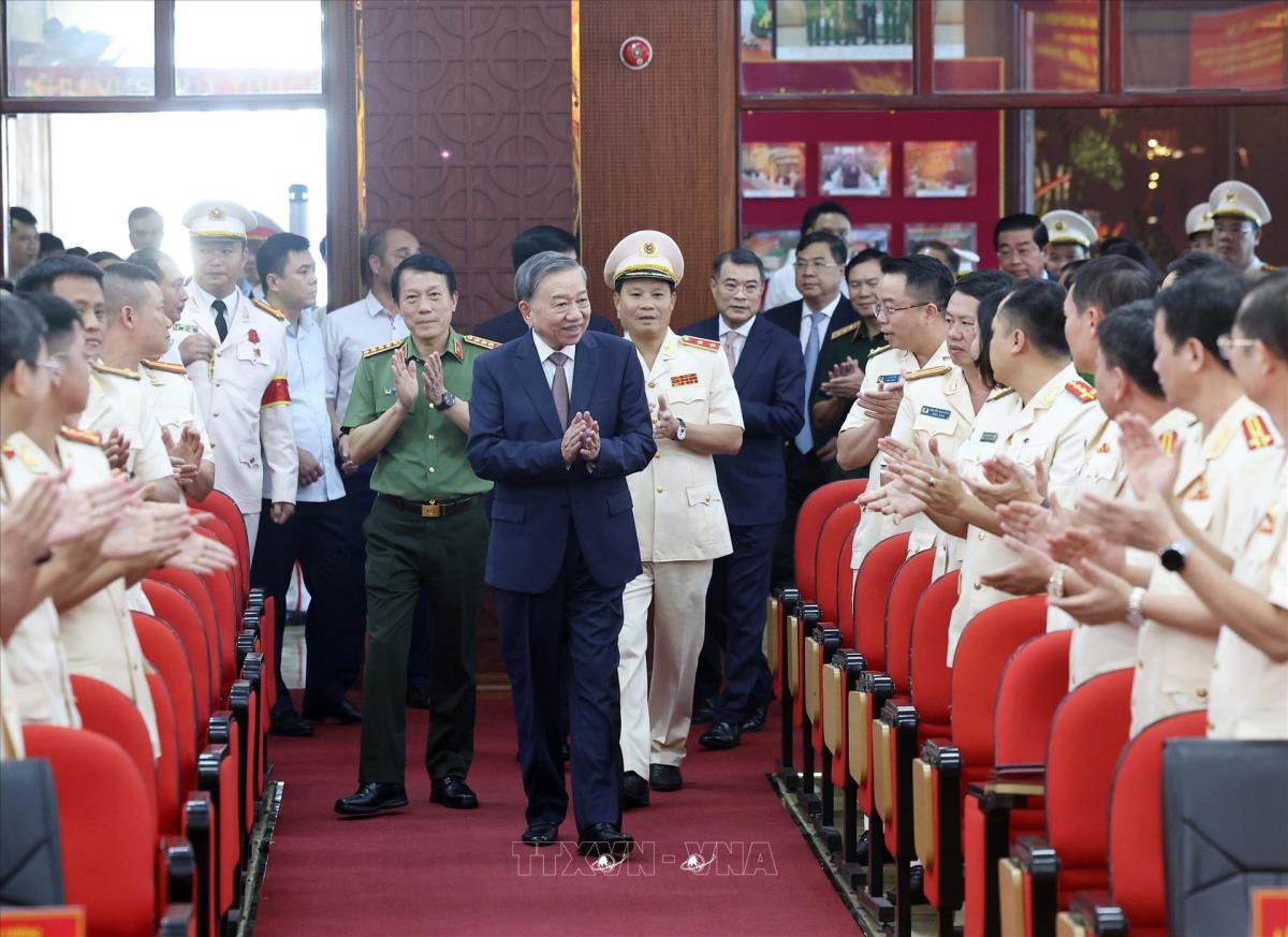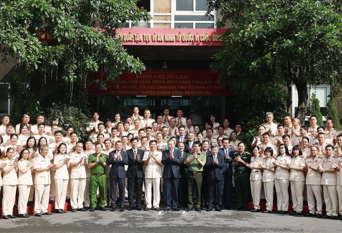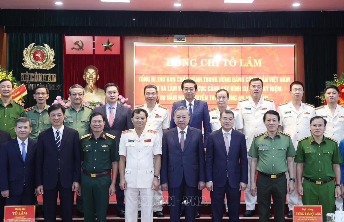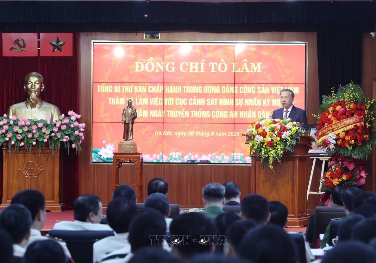 Hà Nội (TTXVN 8/8/2025) Chiều 8/8/2025, tại Hà Nội, Tổng Bí thư Tô Lâm đến thăm, làm việc với Cục Cảnh sát hình sự (Bộ Công an) nhân dịp kỷ niệm 80 năm Ngày truyền thống Công an nhân dân và 20 năm Ngày hội toàn dân bảo vệ an ninh Tổ quốc.