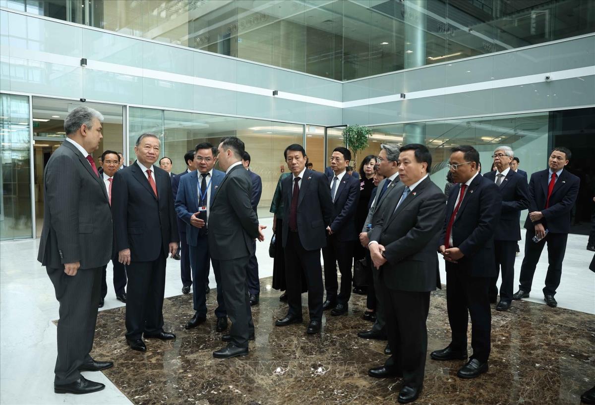 Tổng Bí thư Tô Lâm thăm Trung tâm Tài chính quốc tế Astana (7/5/2025). Ảnh: Thống Nhất - TTXVN