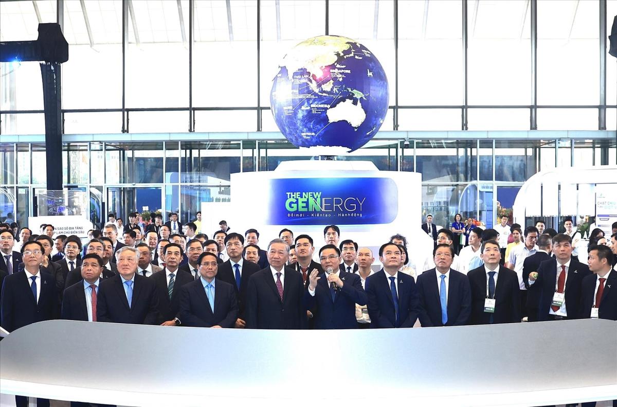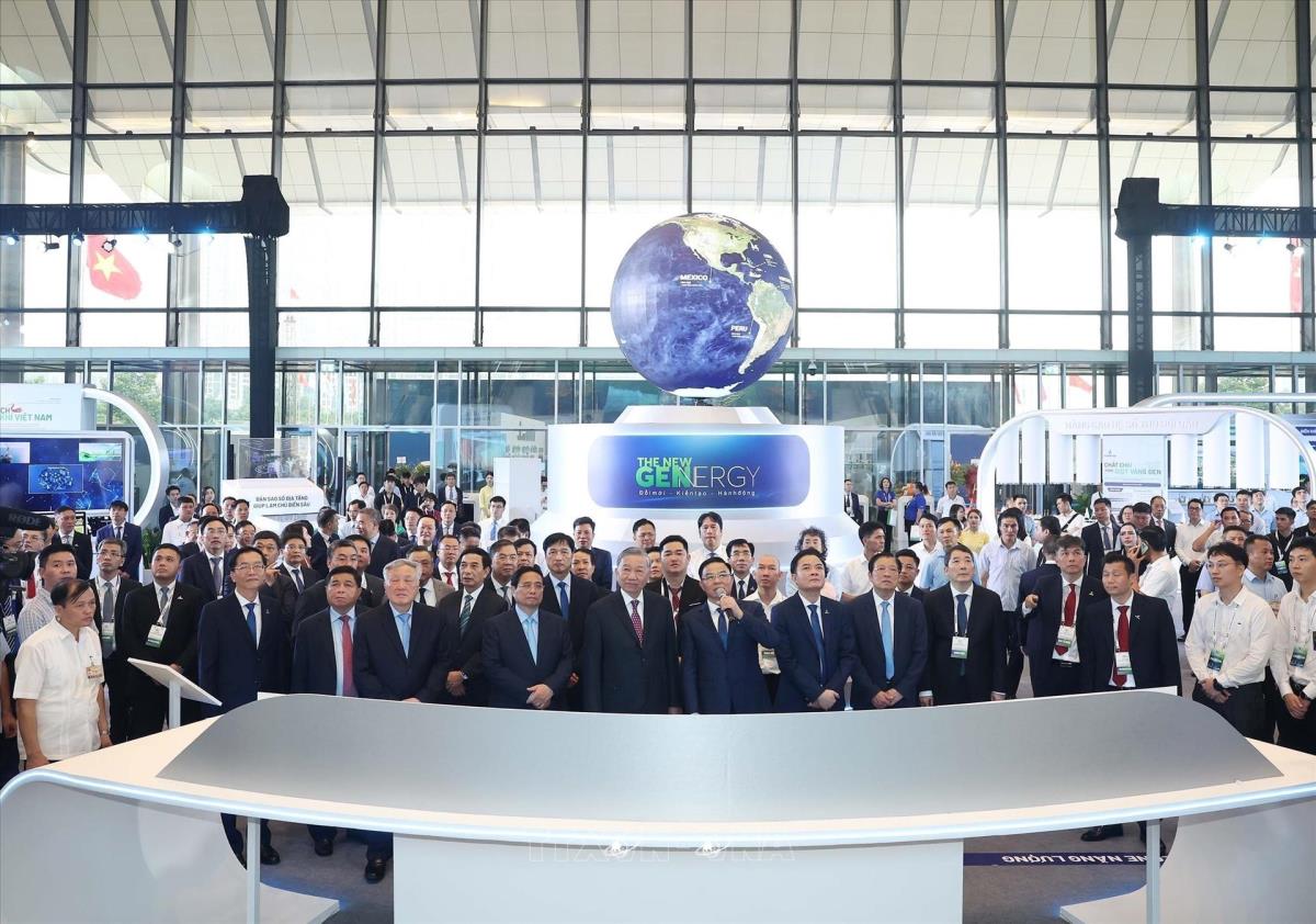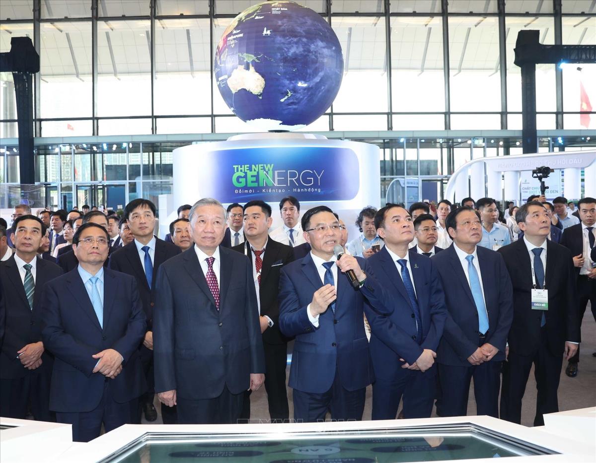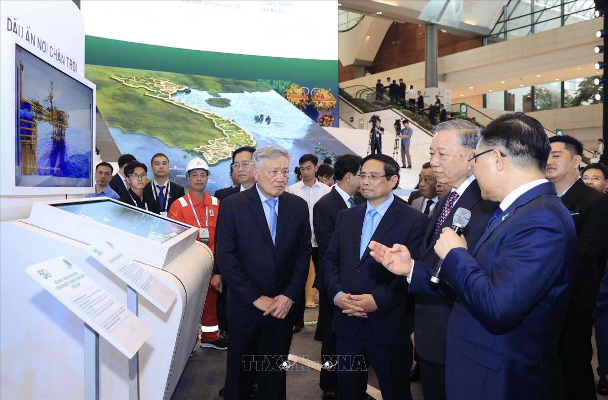 Tổng Bí thư Tô Lâm, Thủ tướng Phạm Minh Chính và các đồng chí lãnh đạo Đảng, Nhà nước tham quan triển lãm thành tựu khoa học công nghệ của Tập đoàn Công nghiệp - Năng lượng quốc gia Việt Nam. Ảnh: Thống Nhất - TTXVN