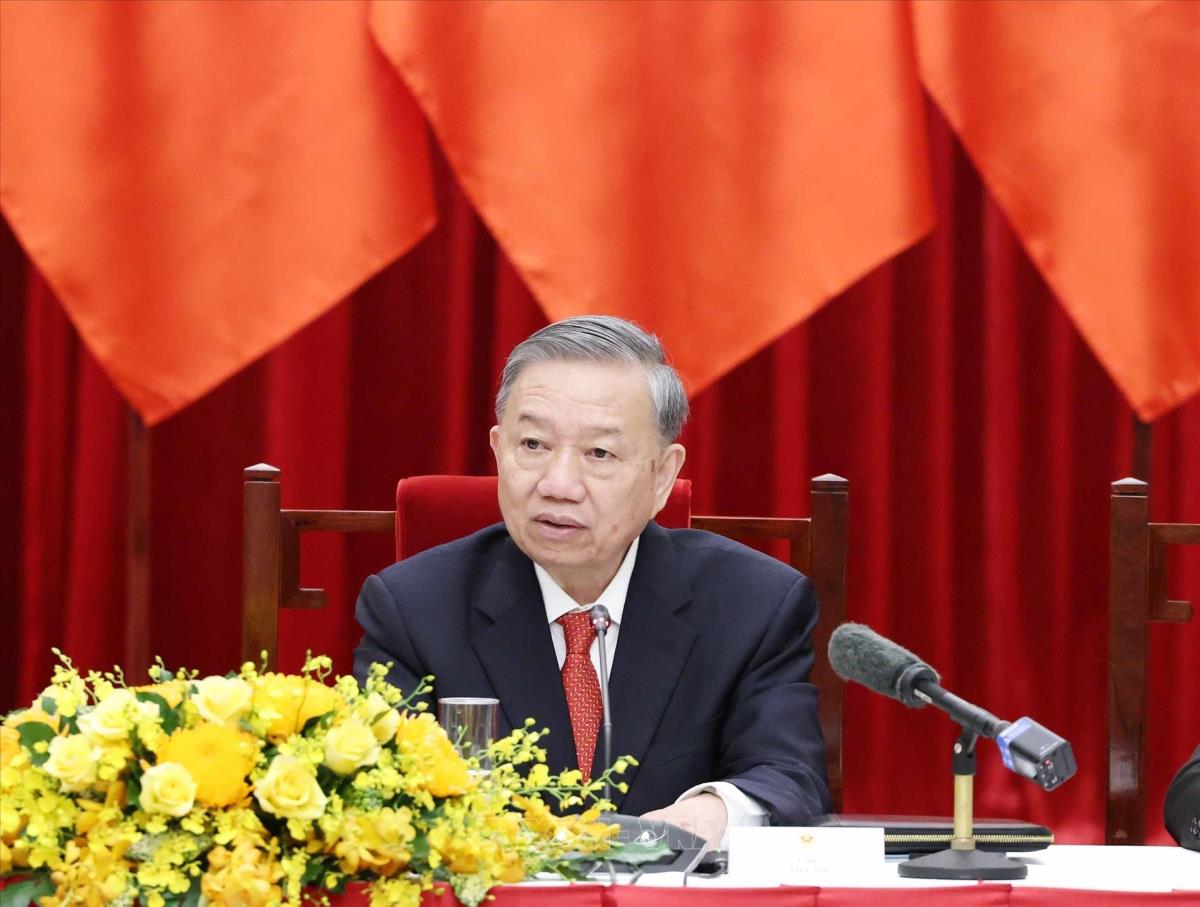 Tổng Bí thư Tô Lâm cùng các đồng chí Lãnh đạo Đảng chủ trì buổi tiếp. Ảnh: Thống Nhất - TTXVN