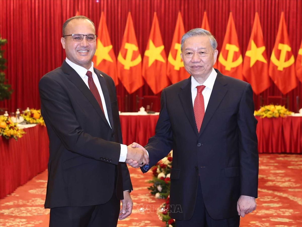 Tổng Bí thư Tô Lâm và Ủy viên Bộ Chính trị, Đảng Mặt trận Giải phóng Dân tộc (FLN) Algeria Bensalem Mohamed (29/4/2025). Ảnh: Thống Nhất - TTXVN