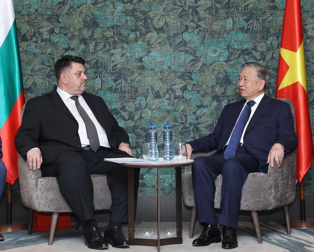 Hà Nội (TTXVN 23/10/2025) Chiều 23/10/2025, giờ địa phương (tối cùng ngày, giờ Hà Nội), tại thủ đô Sofia, Tổng Bí thư Tô Lâm tiếp Chủ tịch Đảng xã hội chủ nghĩa Bulgaria (BSP) Atanas Zafirov.