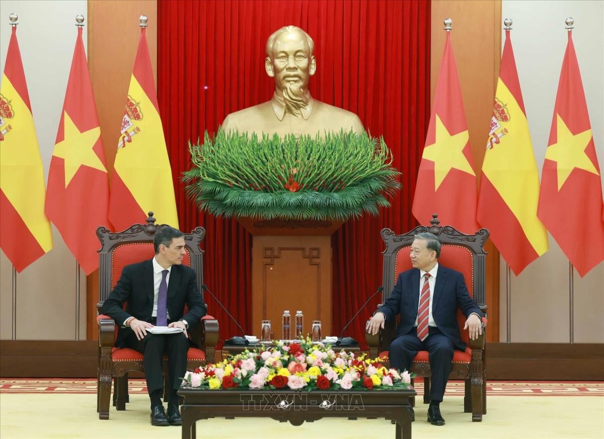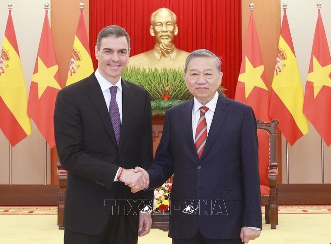 [Photo] Tổng Bí thư Tô Lâm tiếp Thủ tướng Tây Ban Nha