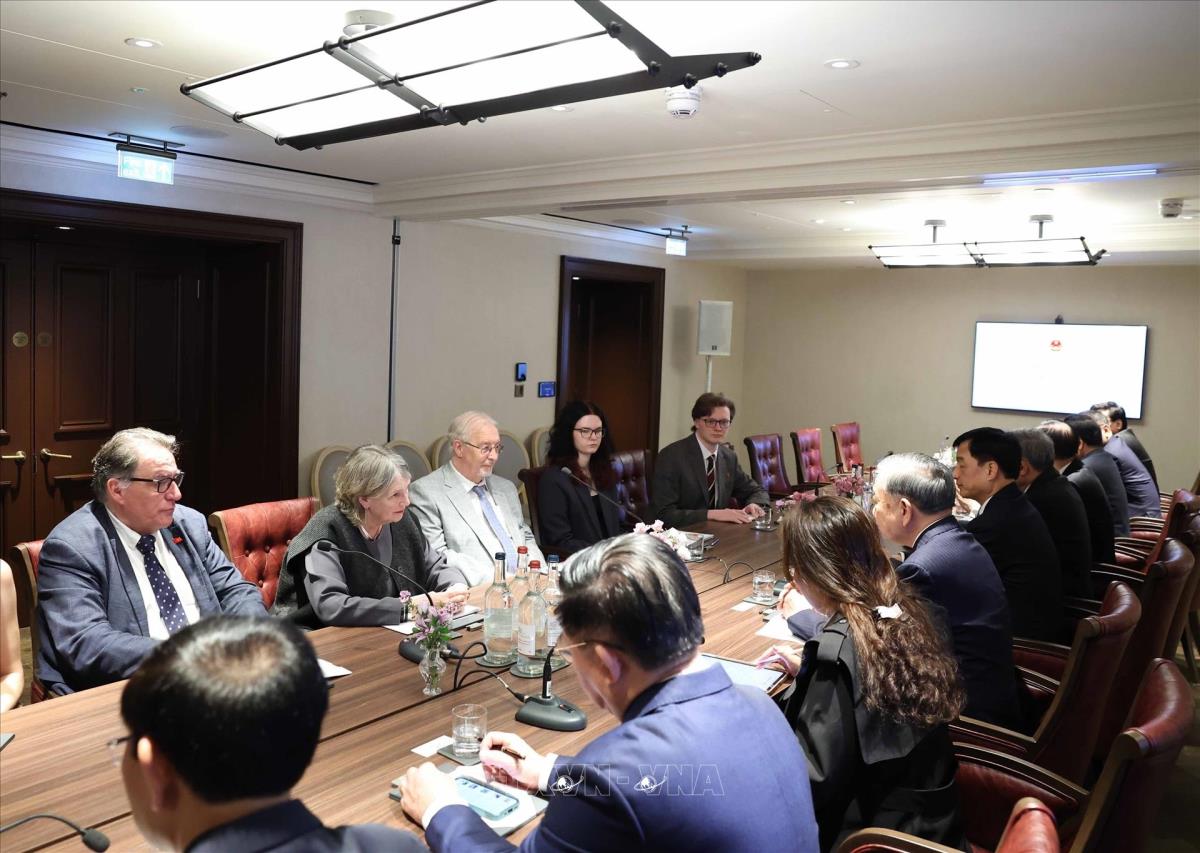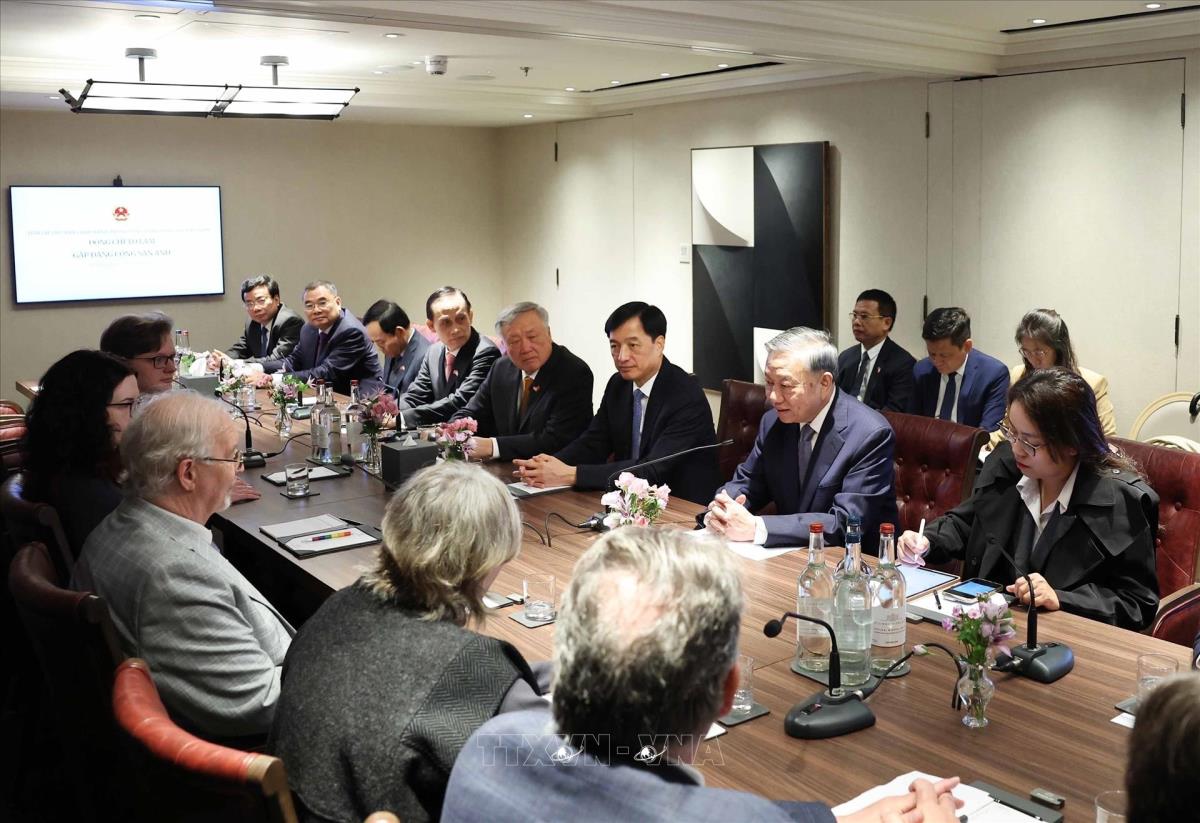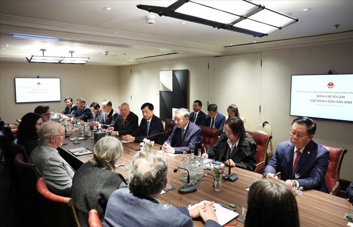 Hà Nội (TTXVN 29/10/2025) Sáng 29/10/2025, giờ địa phương (chiều tối cùng ngày, giờ Hà Nội), tại thủ đô London, Tổng Bí thư Tô Lâm tiếp Tổng Bí thư Đảng Cộng sản Anh (CPB) Robert Griffiths.