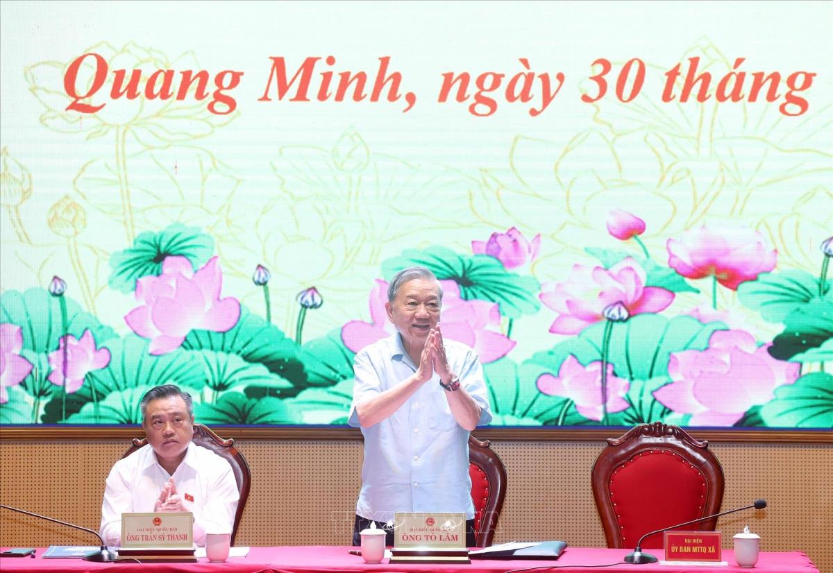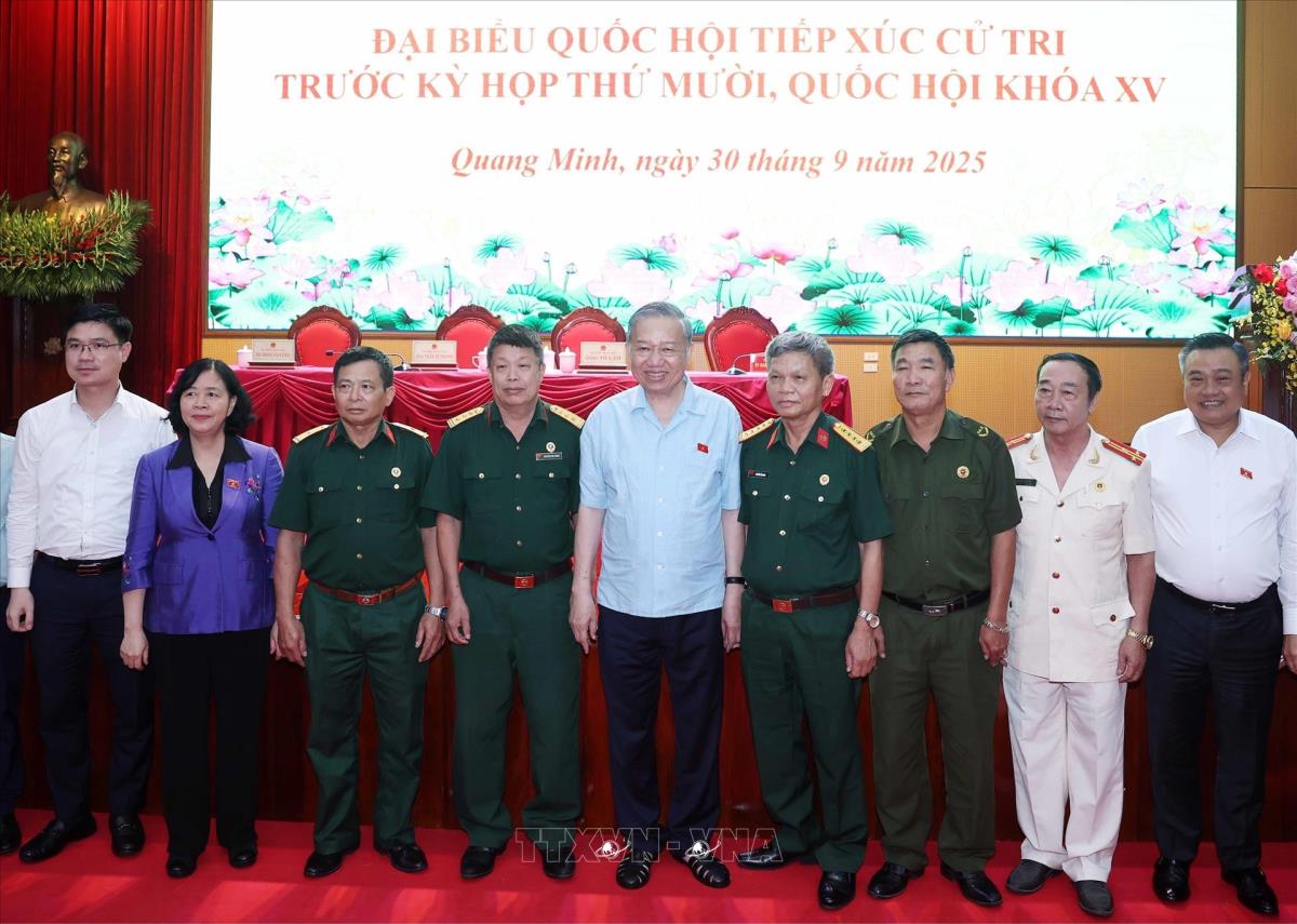 Hà Nội (TTXVN 30/9/2025) Chiều 30/9/2025, tại xã Quang Minh, Tổng Bí thư Tô Lâm cùng các thành viên Đoàn đại biểu Quốc hội thành phố Hà Nội, đơn vị bầu cử số 10 tiếp xúc cử tri 9 xã (Sóc Sơn, Đa Phúc, Nội Bài, Trung Giã, Kim Anh, Mê Linh, Yên Lãng, Tiến Thắng, Quang Minh) trước Kỳ họp thứ Mười, Quốc hội khóa XV.