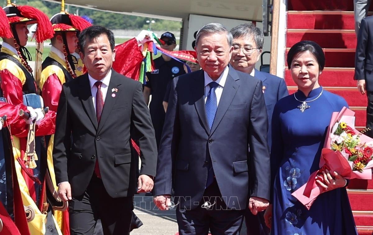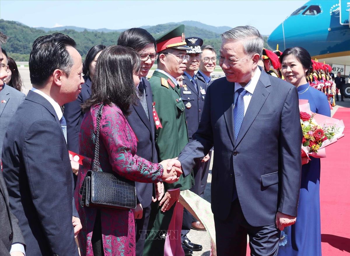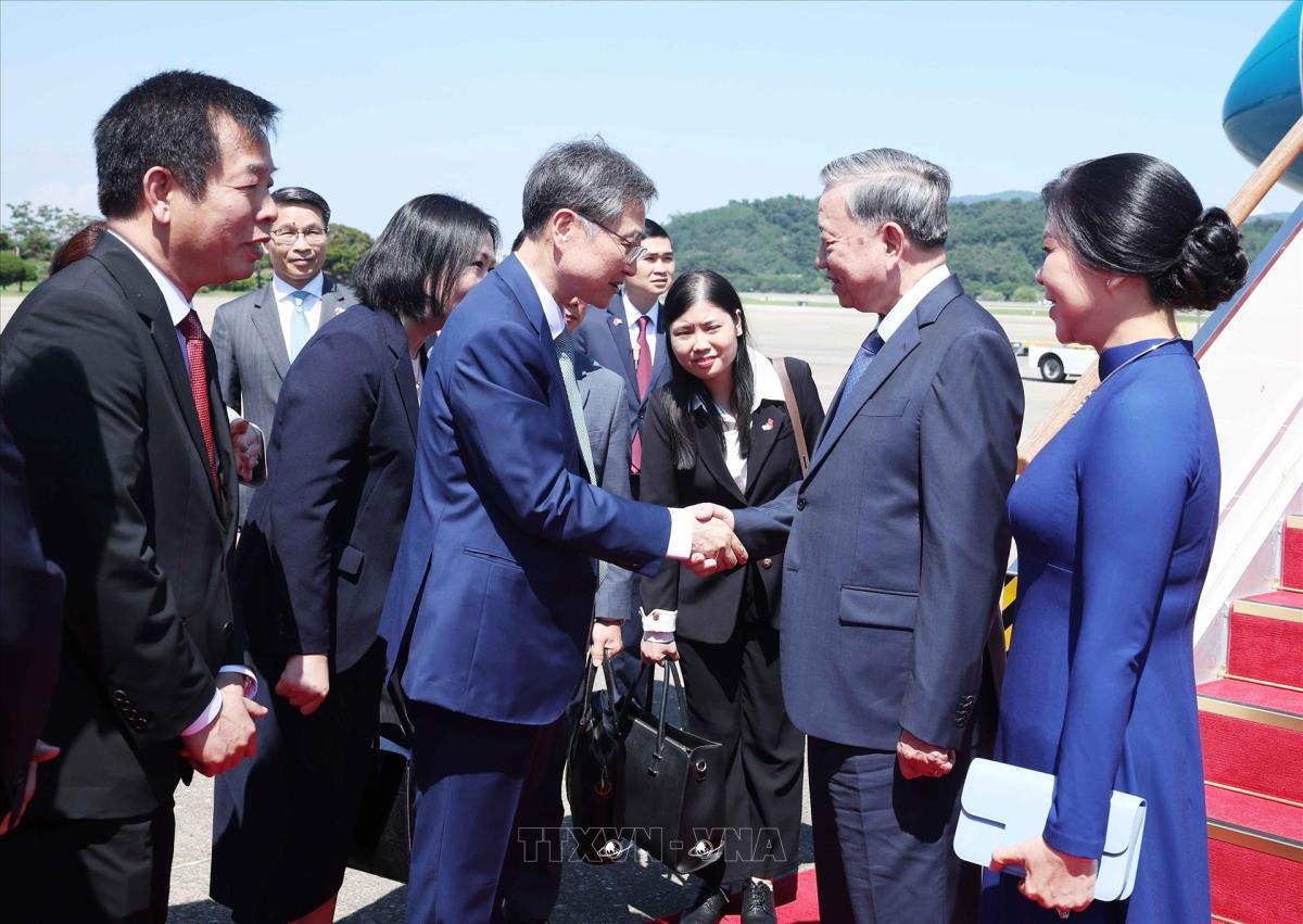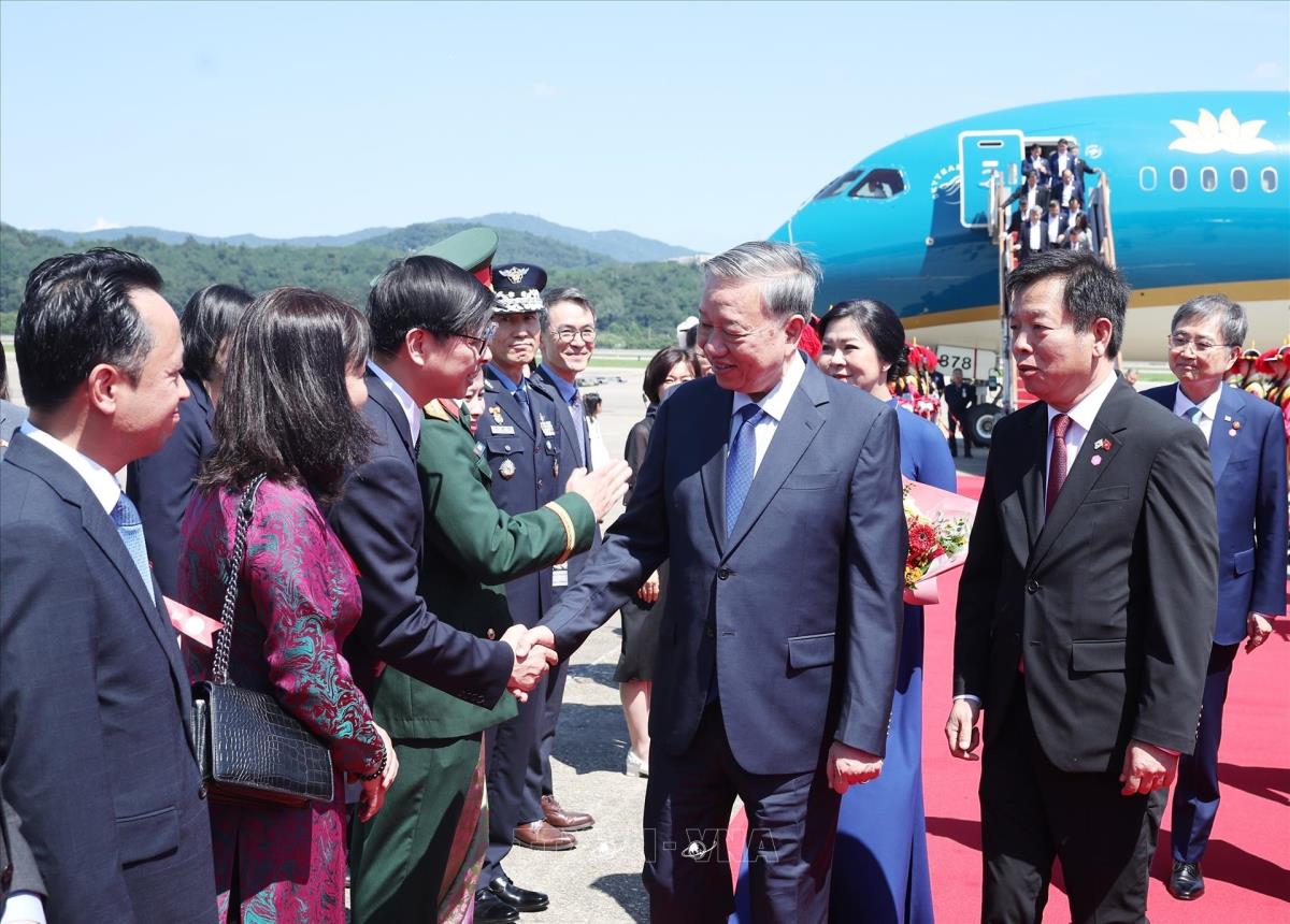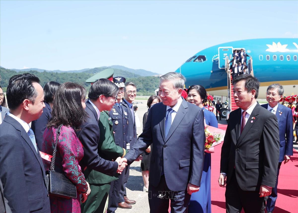 Hà Nội (TTXVN 10/8/2025) Chiều 10/8/2025 (giờ địa phương), Tổng Bí thư Tô Lâm và Phu nhân cùng Đoàn đại biểu cấp cao Việt Nam đến thủ đô Seoul, bắt đầu chuyến thăm cấp Nhà nước tới Hàn Quốc từ ngày 10 đến ngày 13/8 theo lời mời của Tổng thống Lee Jae Myung và Phu nhân.