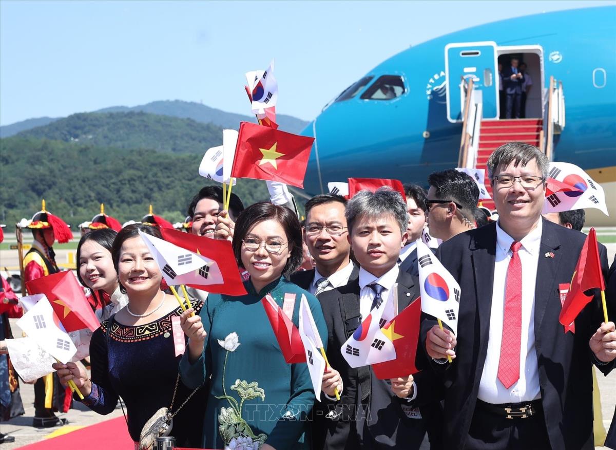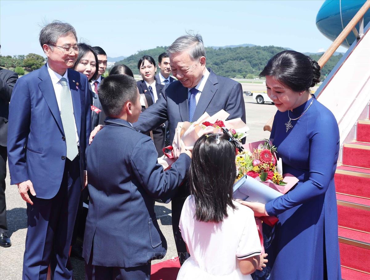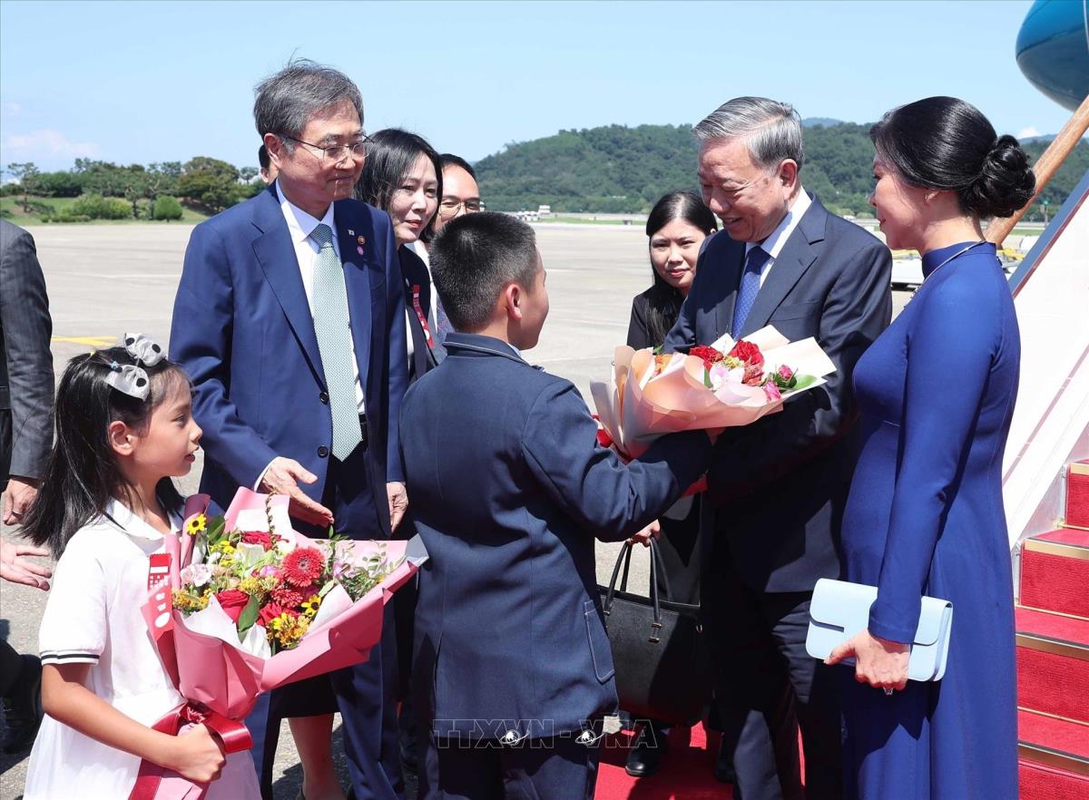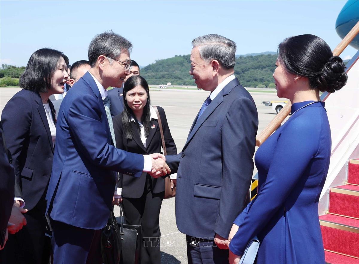 Hà Nội (TTXVN 10/8/2025) Chiều 10/8/2025 (giờ địa phương), Tổng Bí thư Tô Lâm và Phu nhân cùng Đoàn đại biểu cấp cao Việt Nam đến thủ đô Seoul, bắt đầu chuyến thăm cấp Nhà nước tới Hàn Quốc từ ngày 10 đến ngày 13/8 theo lời mời của Tổng thống Lee Jae Myung và Phu nhân.