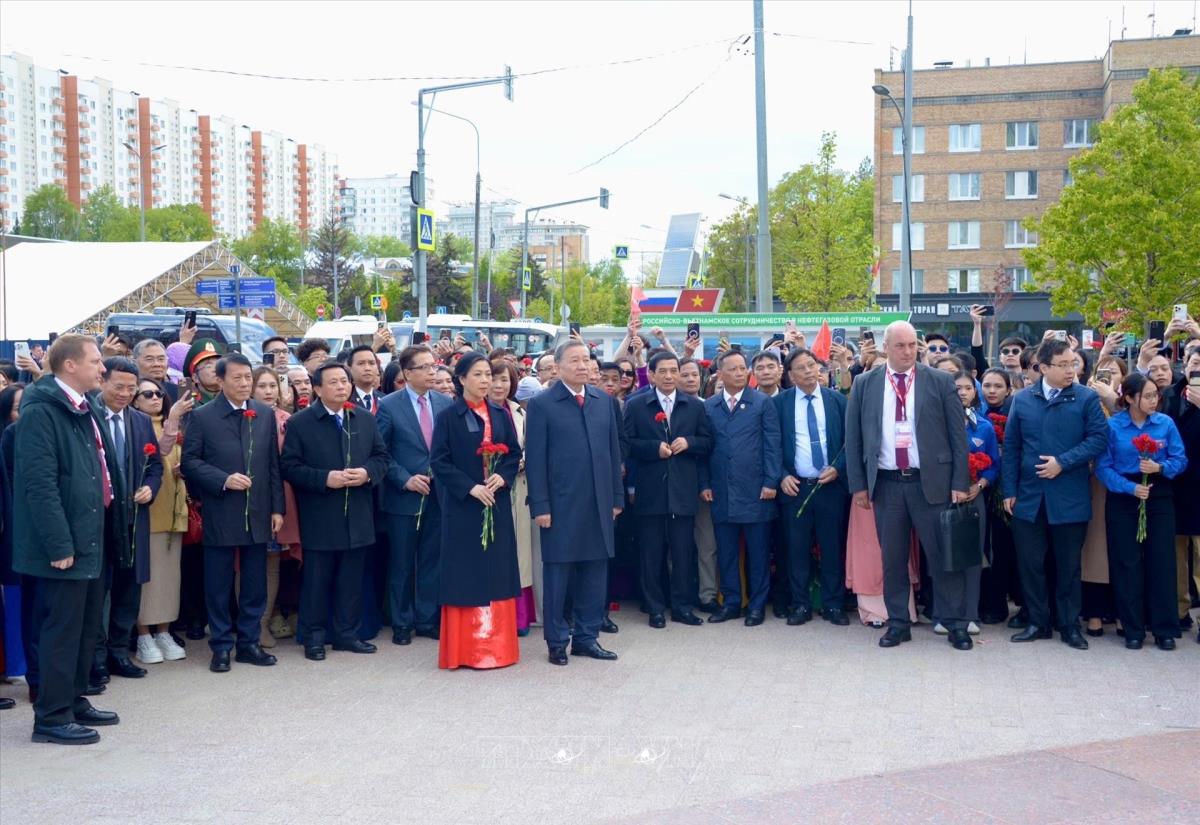 Trong không khí trang nghiêm xúc động, Tổng Bí thư Tô Lâm và Phu nhân cùng Đoàn đại biểu cấp cao Việt Nam đã dâng hoa tưởng nhớ Chủ tịch Hồ Chí Minh, lãnh tụ kính yêu của nhân dân Việt Nam, nhà lãnh đạo lỗi lạc của Đảng Cộng sản Việt Nam và phong trào Cộng sản thế giới, Anh hùng giải phóng dân tộc, nhà văn hóa kiệt xuất. Chủ tịch Hồ Chí Minh cũng là người bạn lớn của nhân dân Nga. Người đã đặt nền móng cho mối quan hệ hữu nghị truyền thống giữa hai nước Việt Nam - Liên bang Nga.