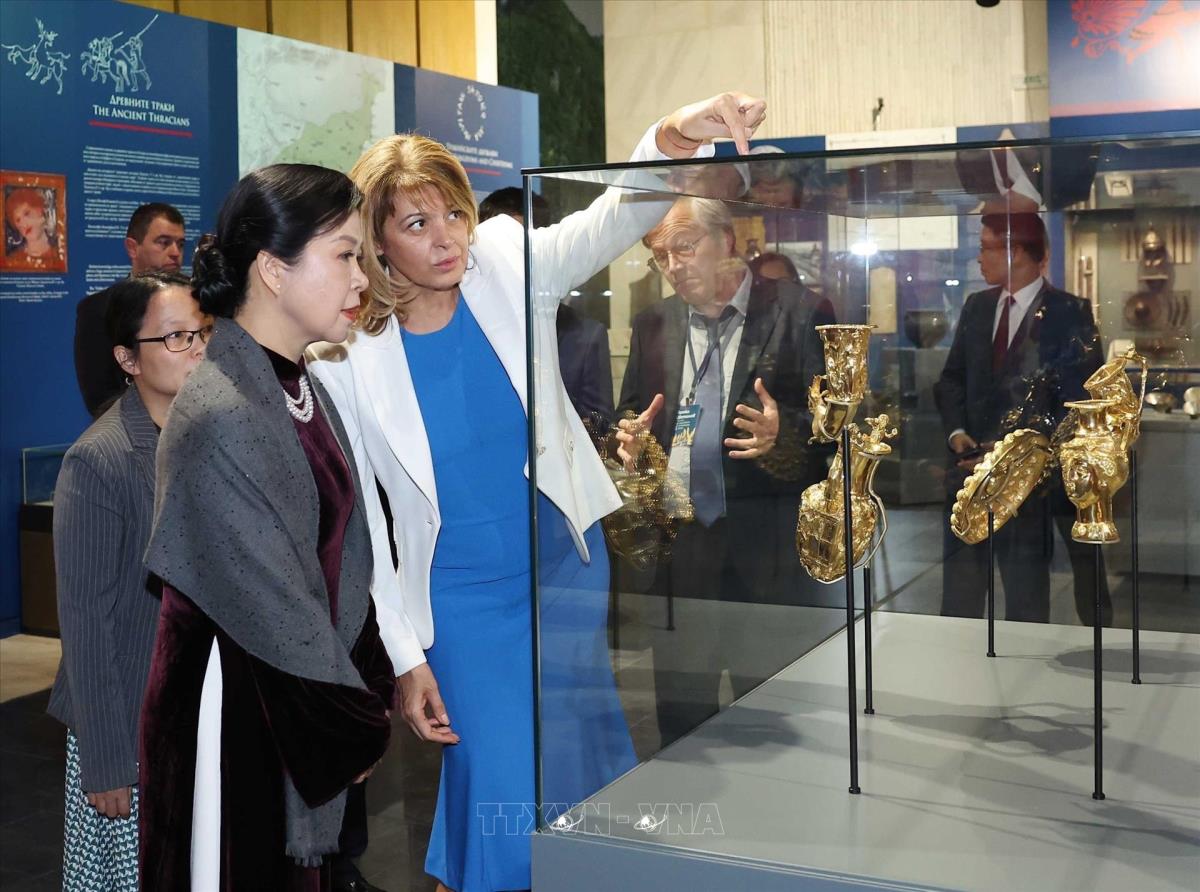 Phu nhân Tổng Bí thư Ngô Phương Ly và với Phu nhân Tổng thống Cộng hòa Bulgaria tại Bảo tàng lịch sử Quốc gia Bulgaria (23/10/2025). Ảnh: Thống Nhất – TTXVN