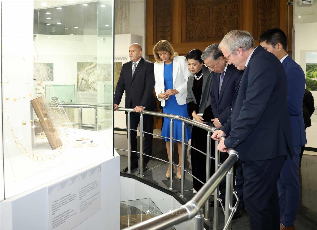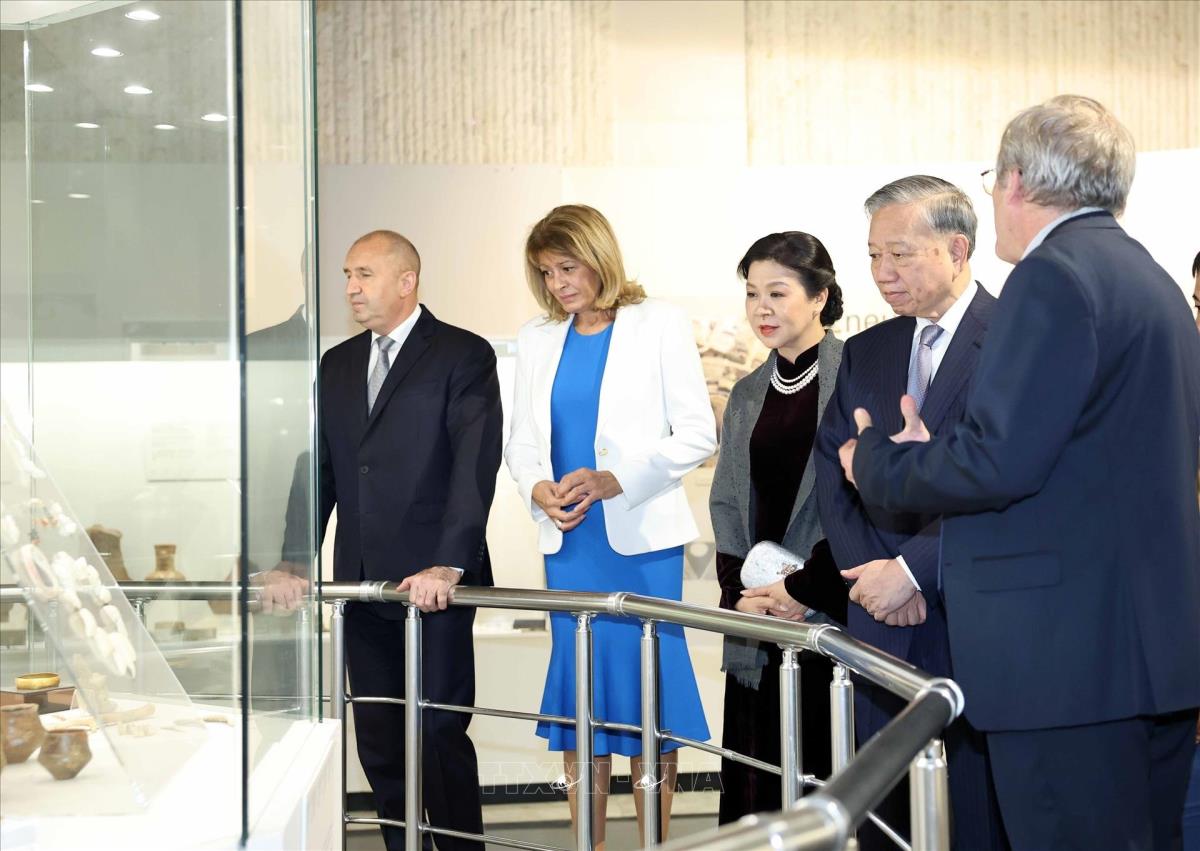 Tổng Bí thư Tô Lâm và Phu nhân với Tổng thống Cộng hòa Bulgaria Rumen Radev và Phu nhân tham quan Bảo tàng lịch sử Quốc gia Bulgaria (23/10/2025). Ảnh: Thống Nhất – TTXVN