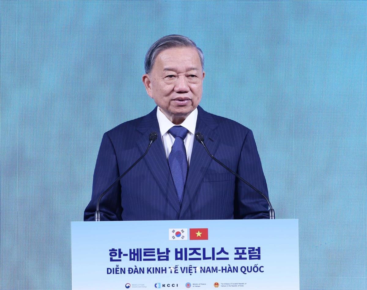 Tổng Bí thư Tô Lâm phát biểu tại Diễn đàn kinh tế Việt Nam – Hàn Quốc (12/8/2025). Ảnh: Thống Nhất – TTXVN