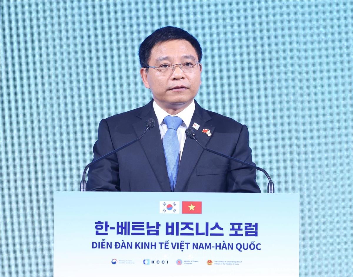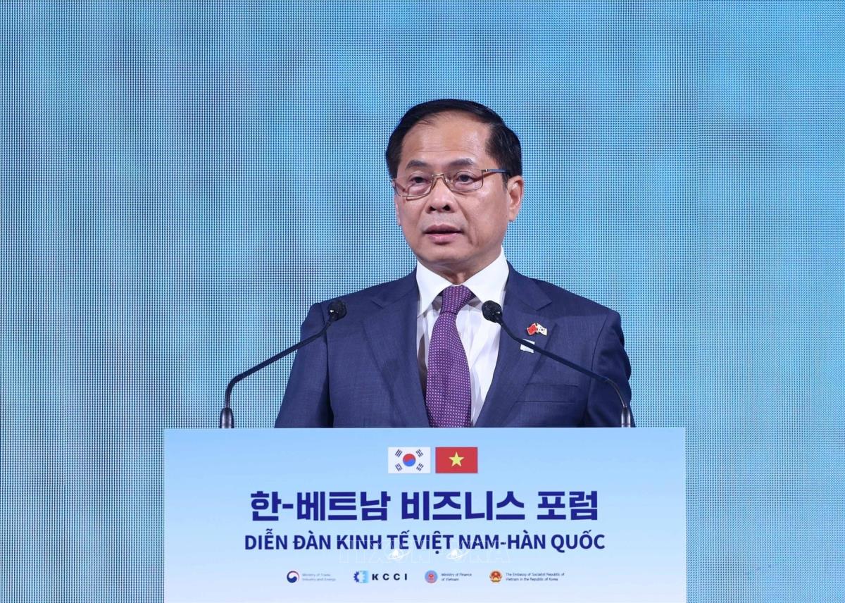 Phó Thủ tướng, Bộ trưởng Ngoại giao Bùi Thanh Sơn phát biểu tại Diễn đàn kinh tế Việt Nam – Hàn Quốc (12/8/2025). Ảnh: Thống Nhất – TTXVN