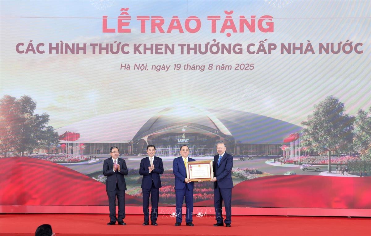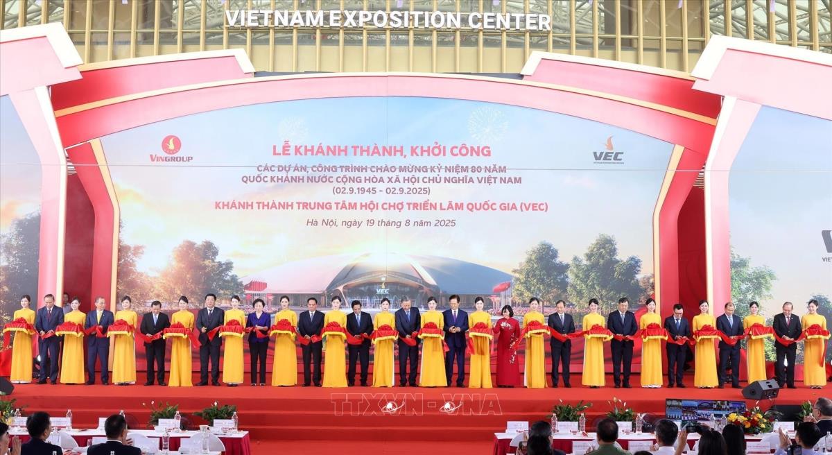 Hà Nội (TTXVN 19/8/2025) Sáng 19/8/2025, tại Đông Anh (Hà Nội) diễn ra Lễ khánh thành Trung tâm hội chợ triển lãm Quốc gia (VEC), rộng hơn 900.000m2 xây dựng trong thời gian kỷ lục gần 10 tháng, với tổng vốn hơn 7.000 tỉ đồng. Tham dự buổi lễ có Tổng Bí thư Tô Lâm, Thủ tướng Chính phủ Phạm Minh Chính, nguyên Thủ tướng Nguyễn Tấn Dũng, nguyên Thường trực Ban Bí thư Lê Hồng Anh, Bí thư Thành uỷ Hà Nội cùng lãnh đạo Chính phủ, các bộ ban ngành khác. Đây là địa điểm tổ chức Triển lãm thành tựu đất nước nhân kỷ niệm 80 năm Ngày Quốc khánh từ 28/8 đến 5/9 tới đây.