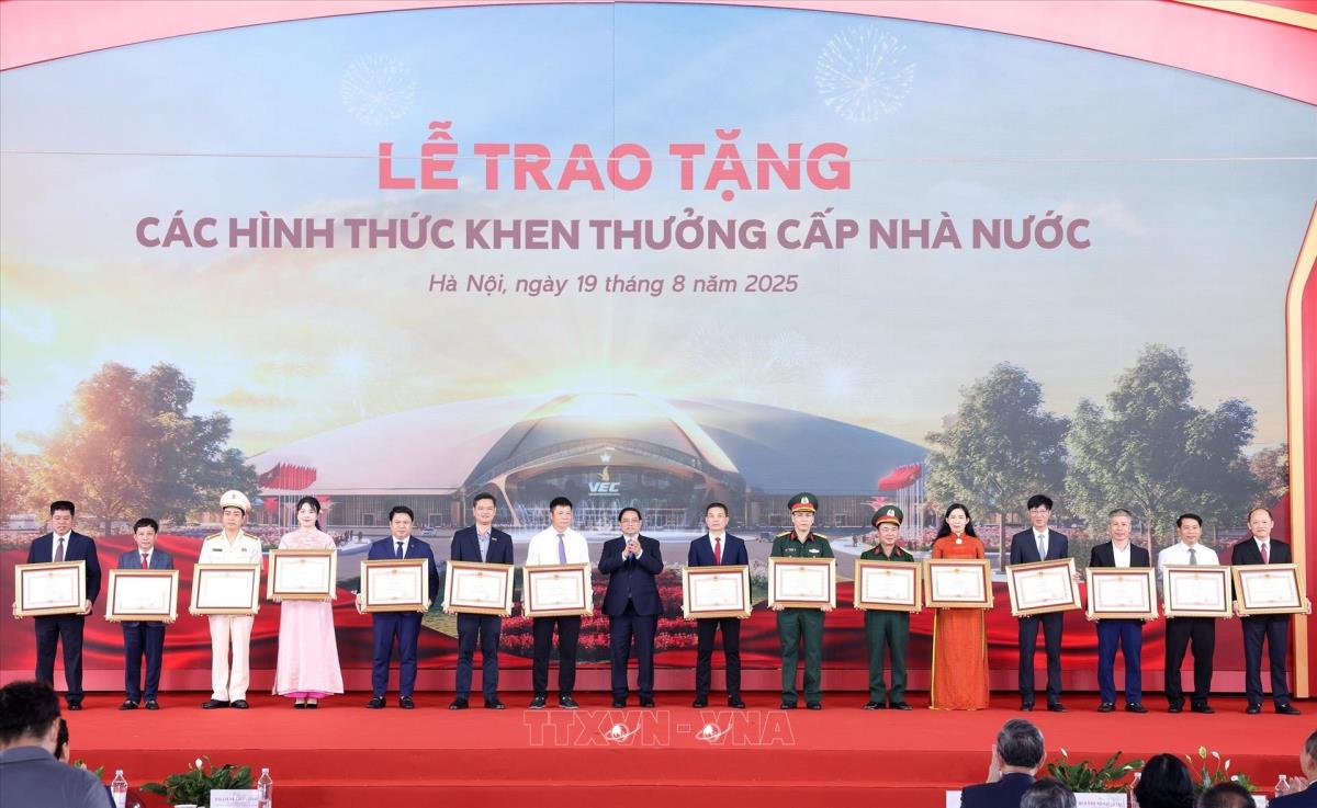 Thủ tướng Phạm Minh Chính trao Bằng khen cho tập thể, cá nhân tại buổi lễ (19/8/2025). Ảnh: Quốc Khánh - TTXVN