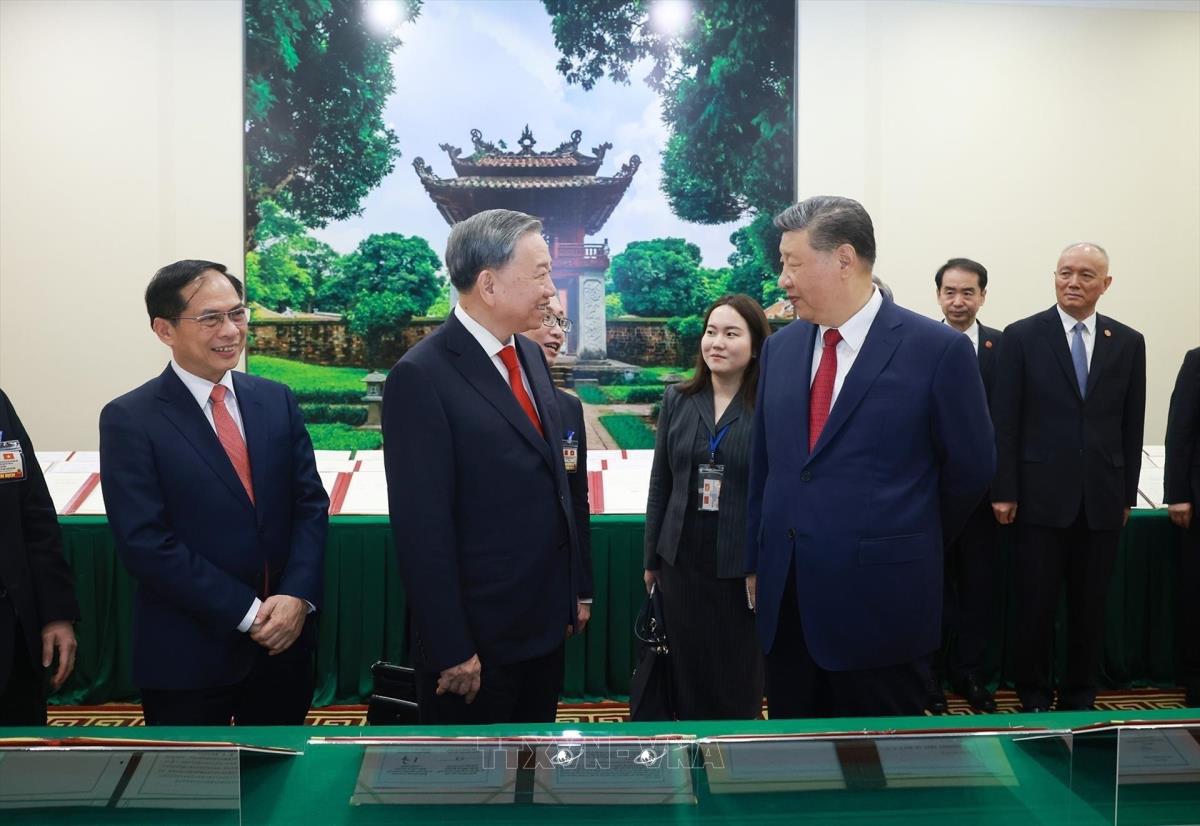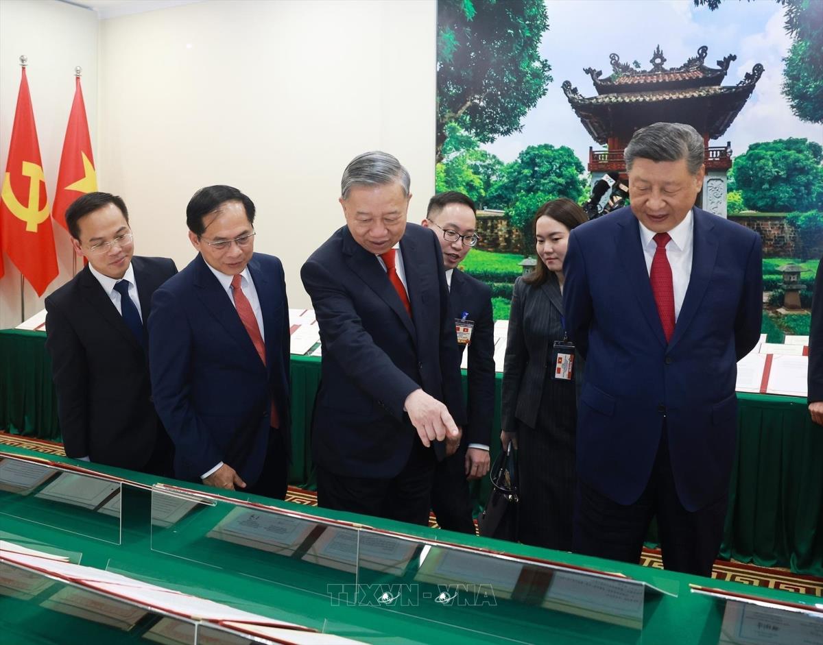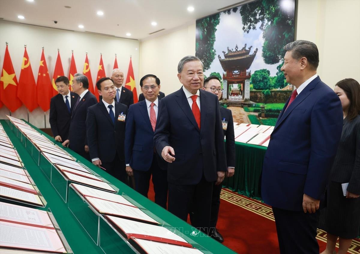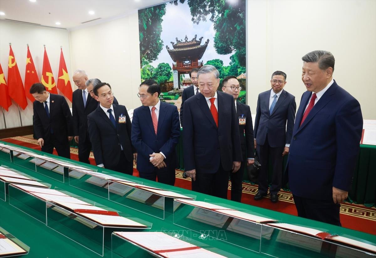 Chiều 14/4/2025, tại Trụ sở Trung ương Đảng, sau Hội đàm cấp cao, Tổng Bí thư Tô Lâm và Tổng Bí thư, Chủ tịch nước Trung Quốc Tập Cận Bình chứng kiến trưng bày các văn kiện hợp tác giữa hai nước.