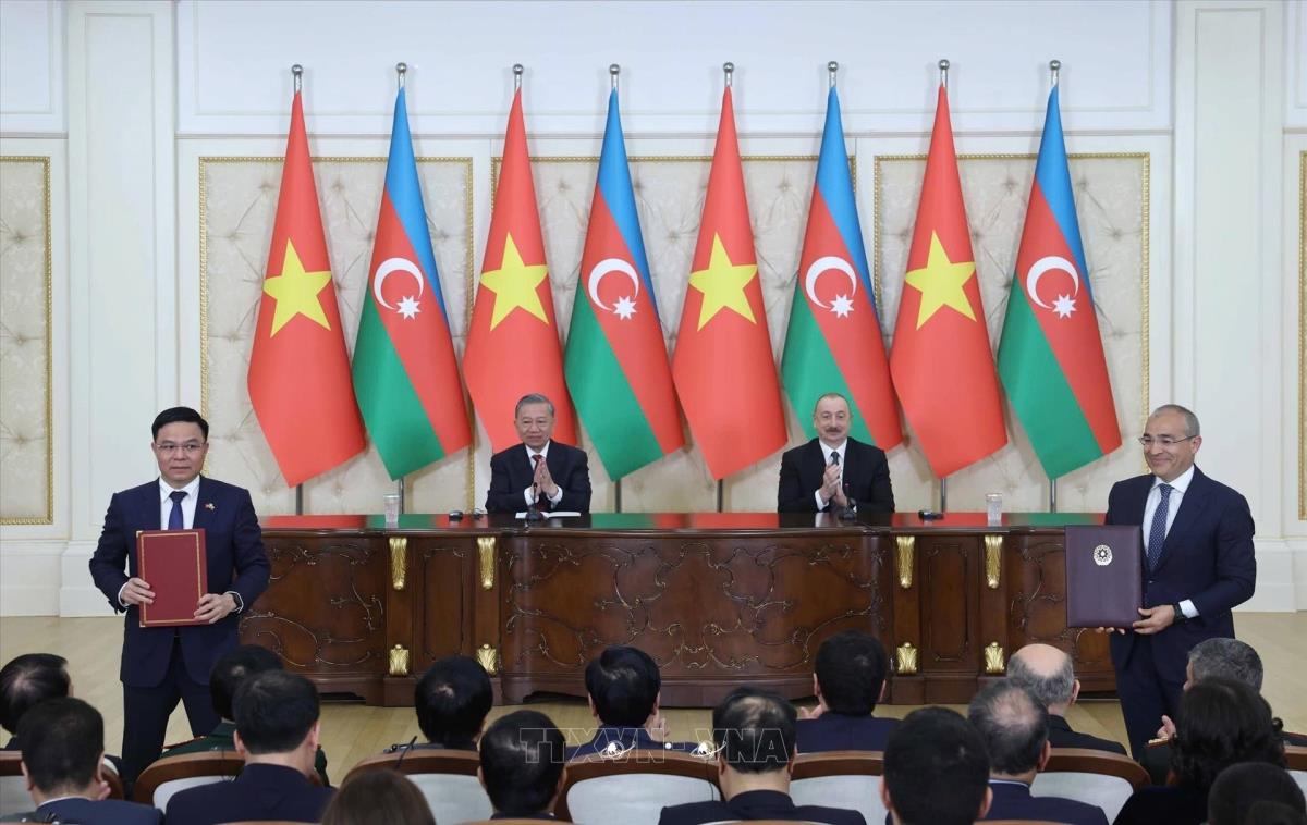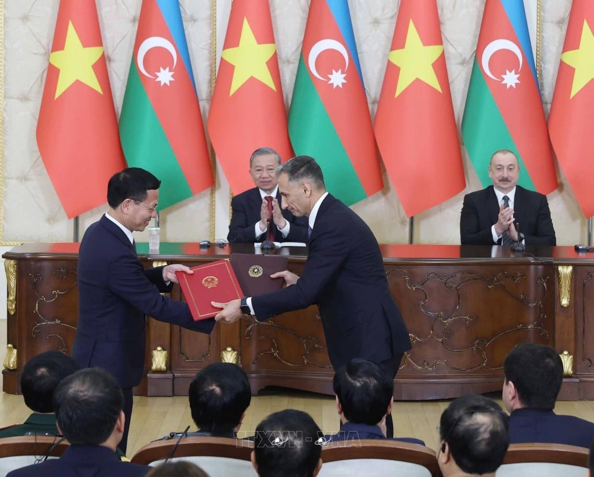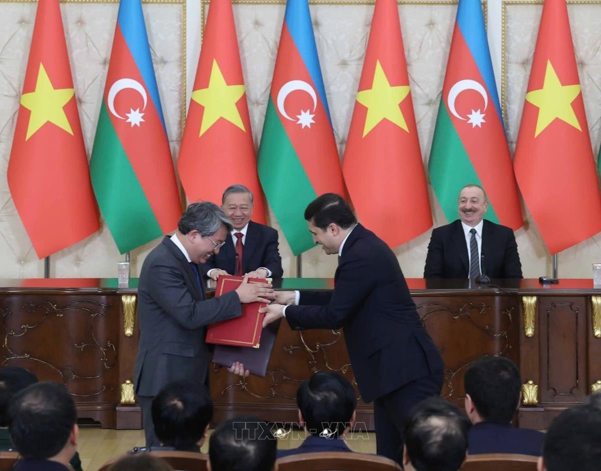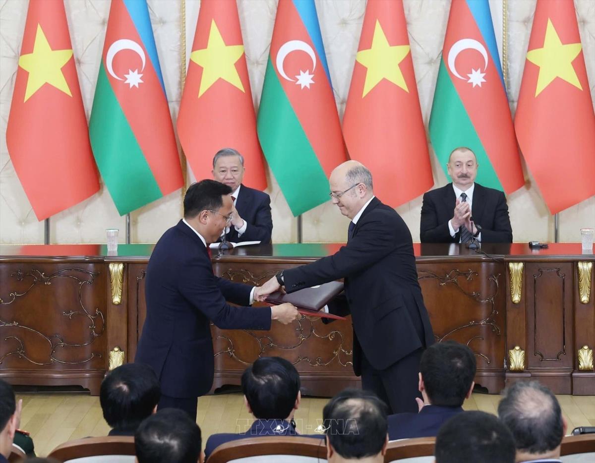 Hà Nội (TTXVN 7/5/2025) Chiều tối 7/5/2025, sau hội đàm cấp Nhà nước tại Phủ Tổng thống - Cung Zugulba ở thủ đô Baku, Tổng Bí thư Tô Lâm và Tổng thống Azerbaijan Ilham Aliyev chứng kiến Lễ trao văn kiện hợp tác giữa hai nước và thông qua Tuyên bố chung về thiết lập quan hệ Đối tác toàn diện Việt Nam - Azerbaijan.