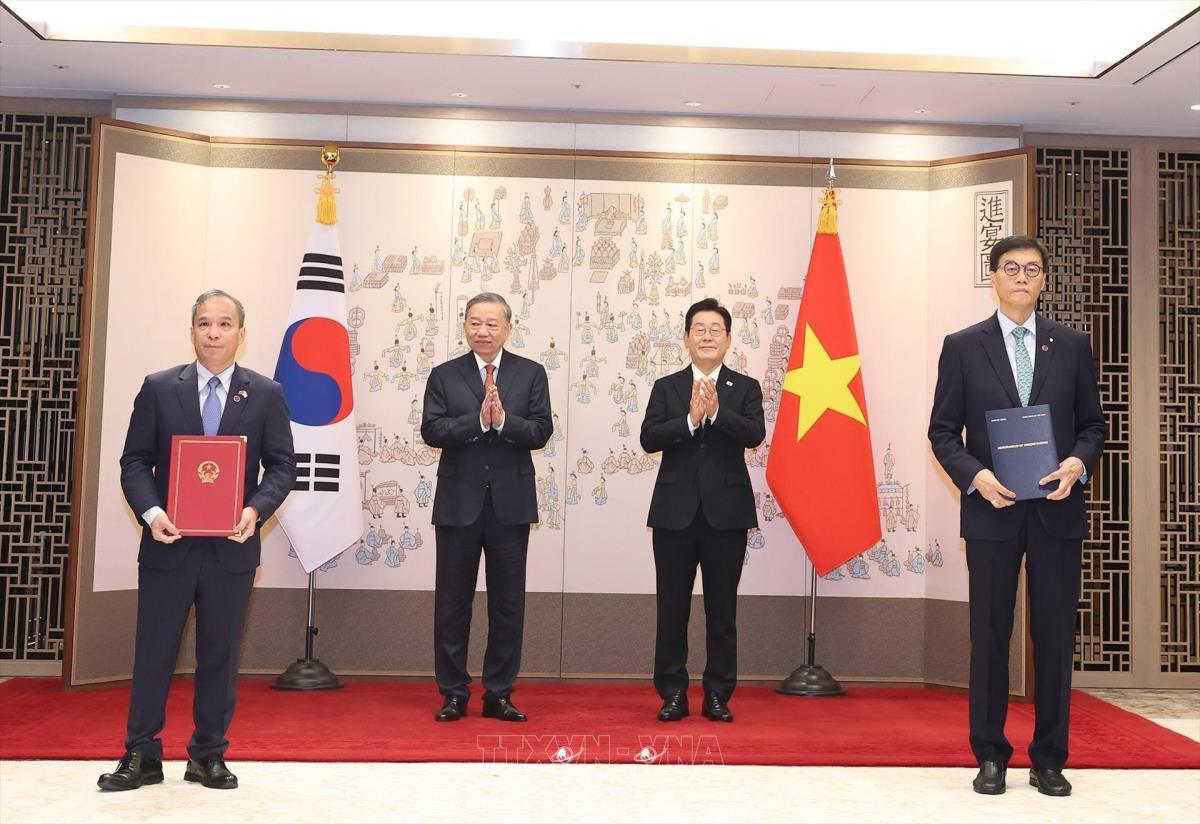Tổng Bí thư Tô Lâm và Tổng thống Hàn Quốc Lee Jae Myung chứng kiến lễ trao Bản ghi nhớ giữa Ngân hàng nhà nước Việt Nam và Ngân hàng Trung ương Hàn Quốc về hợp tác và hỗ trợ kỹ thuật liên quan đến hoạt động Ngân hàng Trung ương (11/8/2025). Ảnh: Thống Nhất – TTXVN