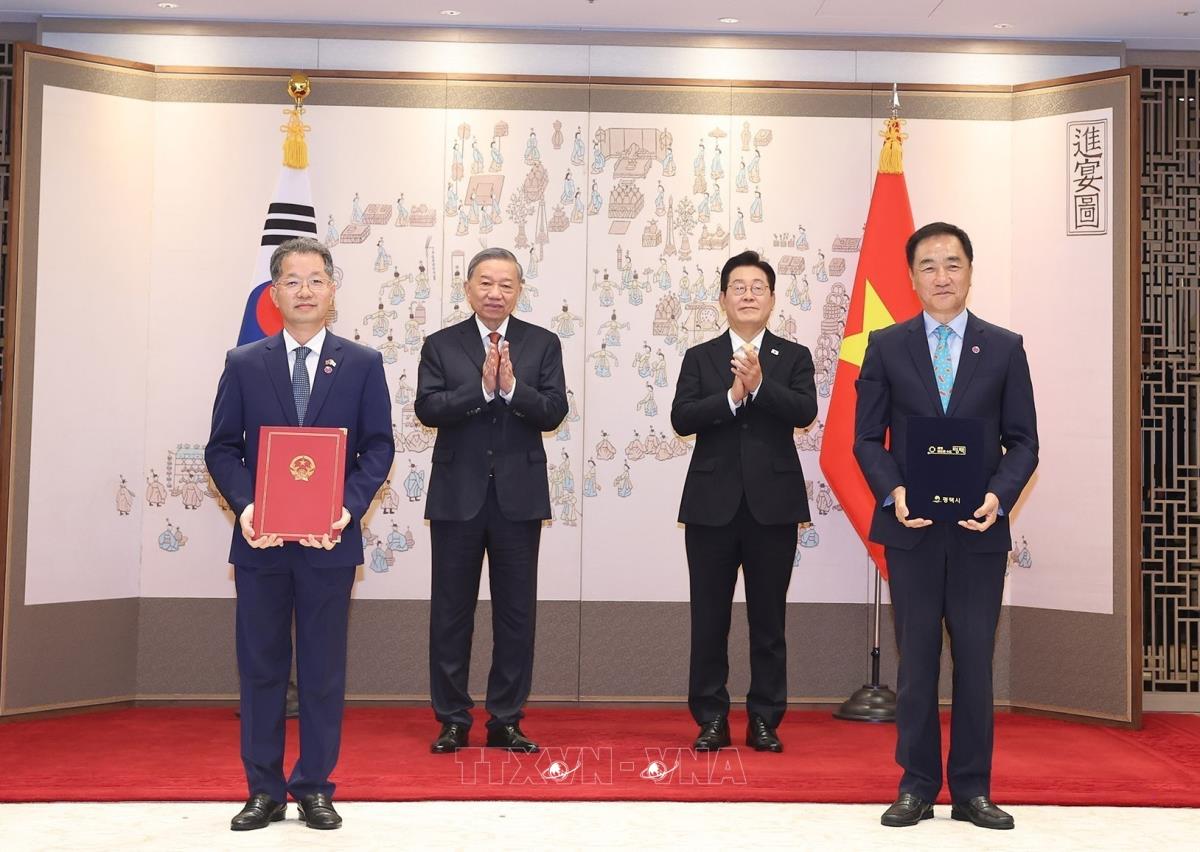 Tổng Bí thư Tô Lâm và Tổng thống Hàn Quốc Lee Jae Myung chứng kiến lễ trao Biên bản thỏa thuận tăng cường hợp tác giữa Ủy ban nhân dân thành phố Đà Nẵng (Việt Nam) và Chính quyền thành phố Pyeongtaek (Hàn Quốc) (11/8/2025). Ảnh: Thống Nhất – TTXVN