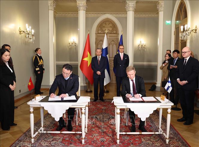 Hà Nội (TTXVN 21/10/2025) Theo đặc phái viên TTXVN, trong khuôn khổ chuyến thăm chính thức của Tổng Bí thư Tô Lâm và Phu nhân cùng Đoàn đại biểu cấp cao Việt Nam tới Cộng hòa Phần Lan, trưa 21/10 (theo giờ địa phương), tại Phủ Tổng thống, Tổng Bí thư Tô Lâm và Tổng thống Cộng hòa Phần Lan Alexander Stubb đã chứng kiến Lễ ký kết các văn kiện hợp tác song phương Việt Nam - Phần Lan.