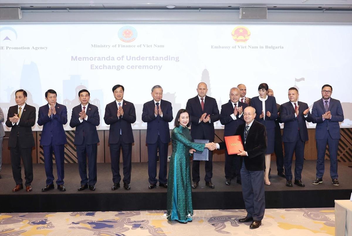 Tổng Bí thư Tô Lâm và Tổng thống Bulgaria Rumen Radev chứng kiến lễ trao Thỏa thuận hợp tác về công tác trọng tài giữa Trung tâm Trọng tài quốc tế Việt Nam với Tòa trọng tài (thuộc Phòng Thương mại và Công nghiệp Bulgaria - BCCI) (23/10/2025). Ảnh: Thống Nhất – TTXVN