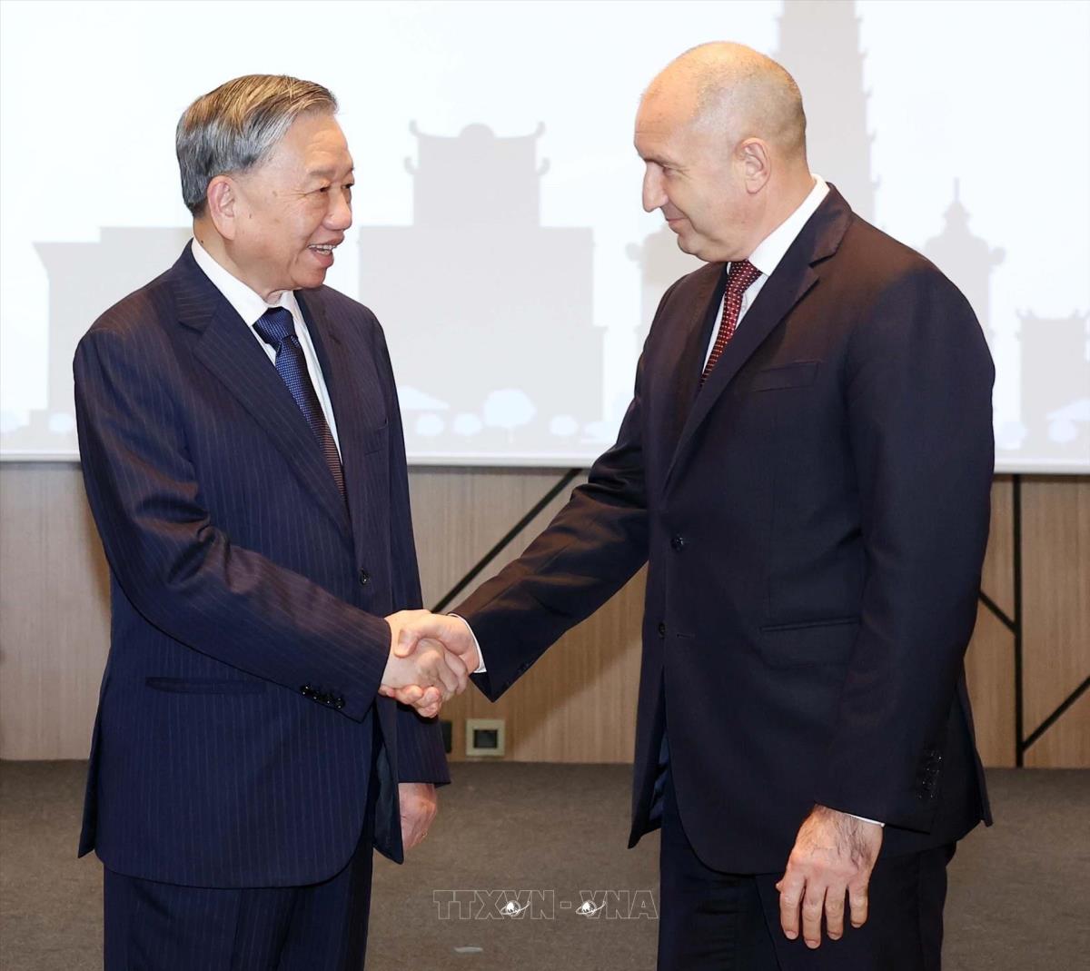 Tổng thống Rumen Radev đón Tổng Bí thư Tô Lâm đến dự Diễn đàn Doanh nghiệp Việt Nam- Bulgaria (23/10/2025). Ảnh: Thống Nhất – TTXVN
