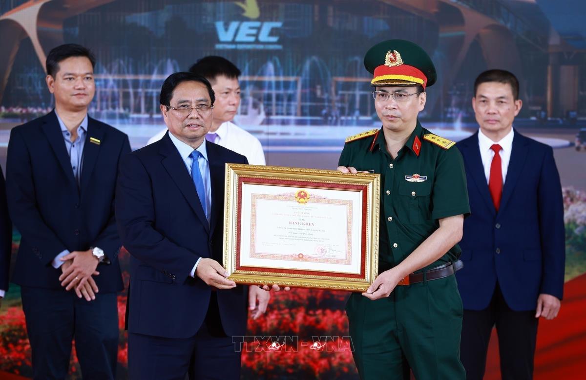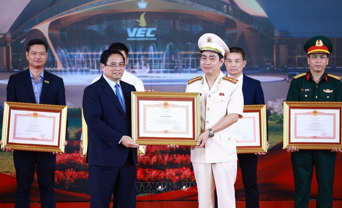 Thủ tướng Phạm Minh Chính trao Bằng khen cho các tập thể và cá nhân có thành tích xuất sắc trong đợt thi đua cao điểm “500 ngày đêm thi công hoàn thành 3000 km đường bộ cao tốc" (19/8/2025). Ảnh: Dương Giang-TTXVN