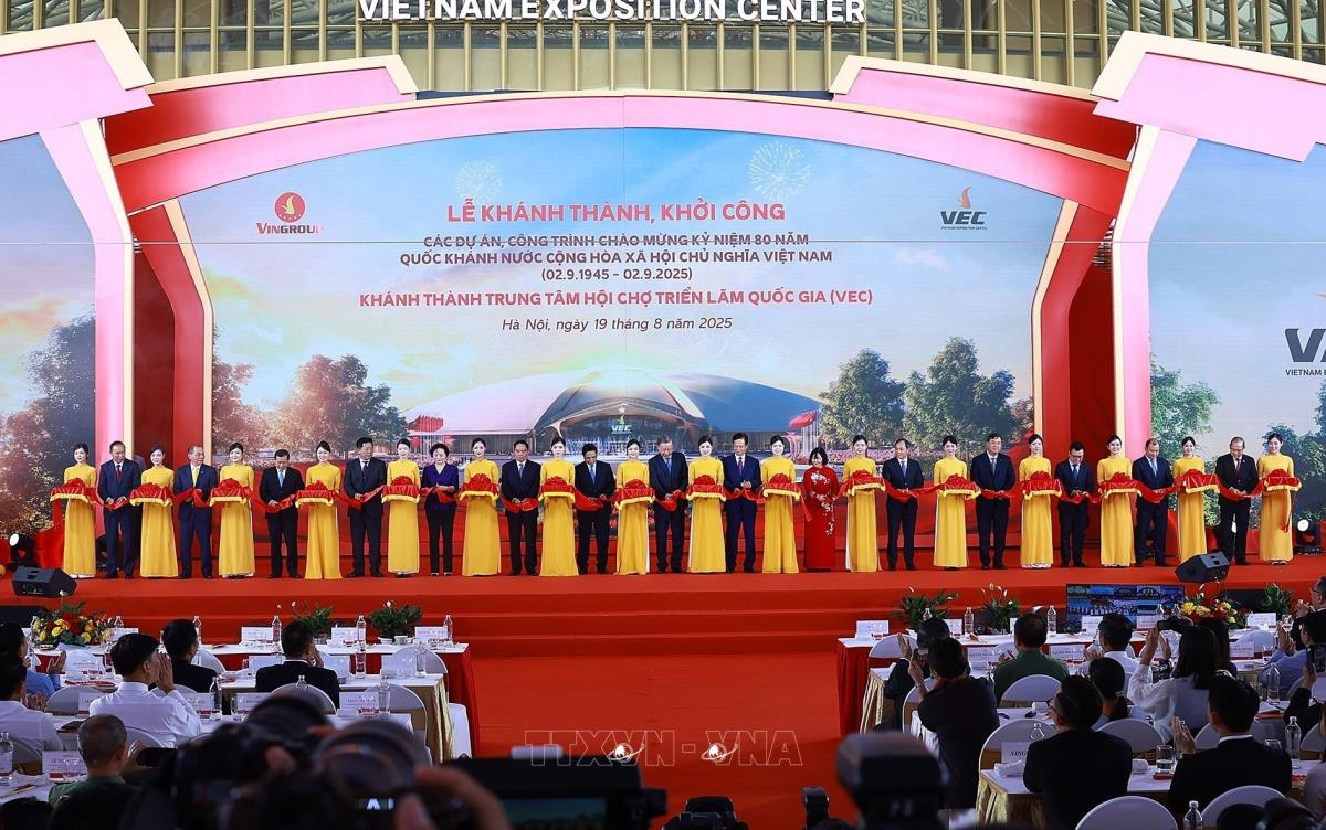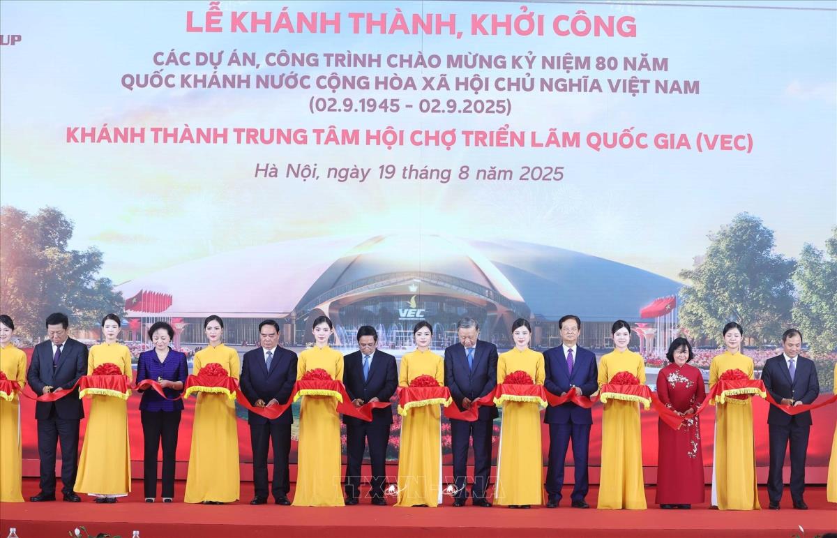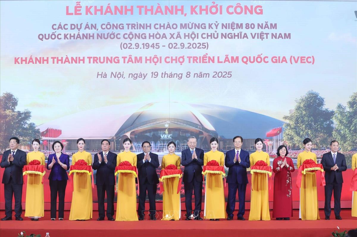 Hà Nội (TTXVN 19/8/2025) Sáng 19/8/2025, Tổng Bí thư Tô Lâm và Thủ tướng Phạm Minh Chính dự và chủ trì Lễ khánh thành, khởi công các dự án, công trình chào mừng kỷ niệm 80 năm Quốc khánh nước Cộng hòa Xã hội chủ nghĩa Việt Nam (2/9/1945 – 2/9/2025) tại Trung tâm Triển lãm Việt Nam (xã Đông Anh, thành phố Hà Nội).