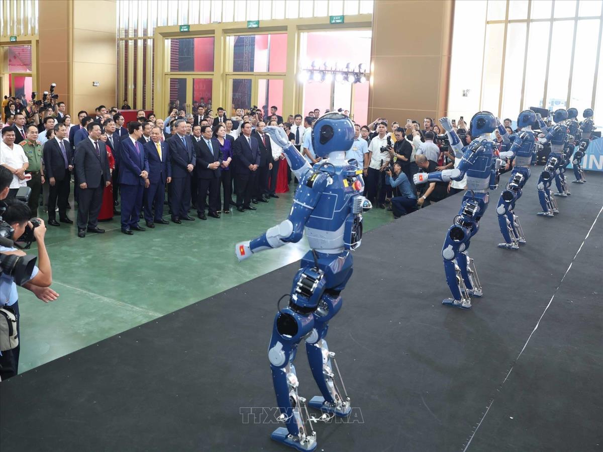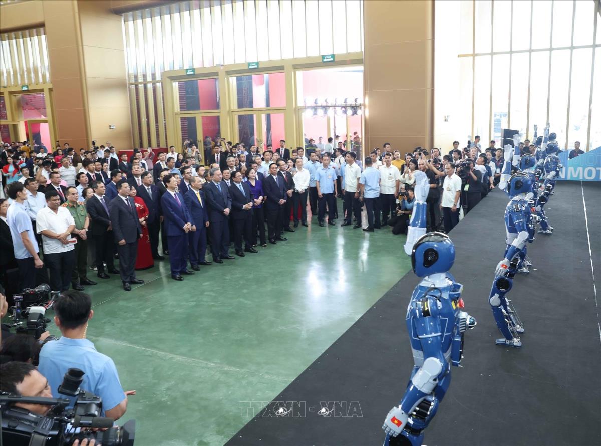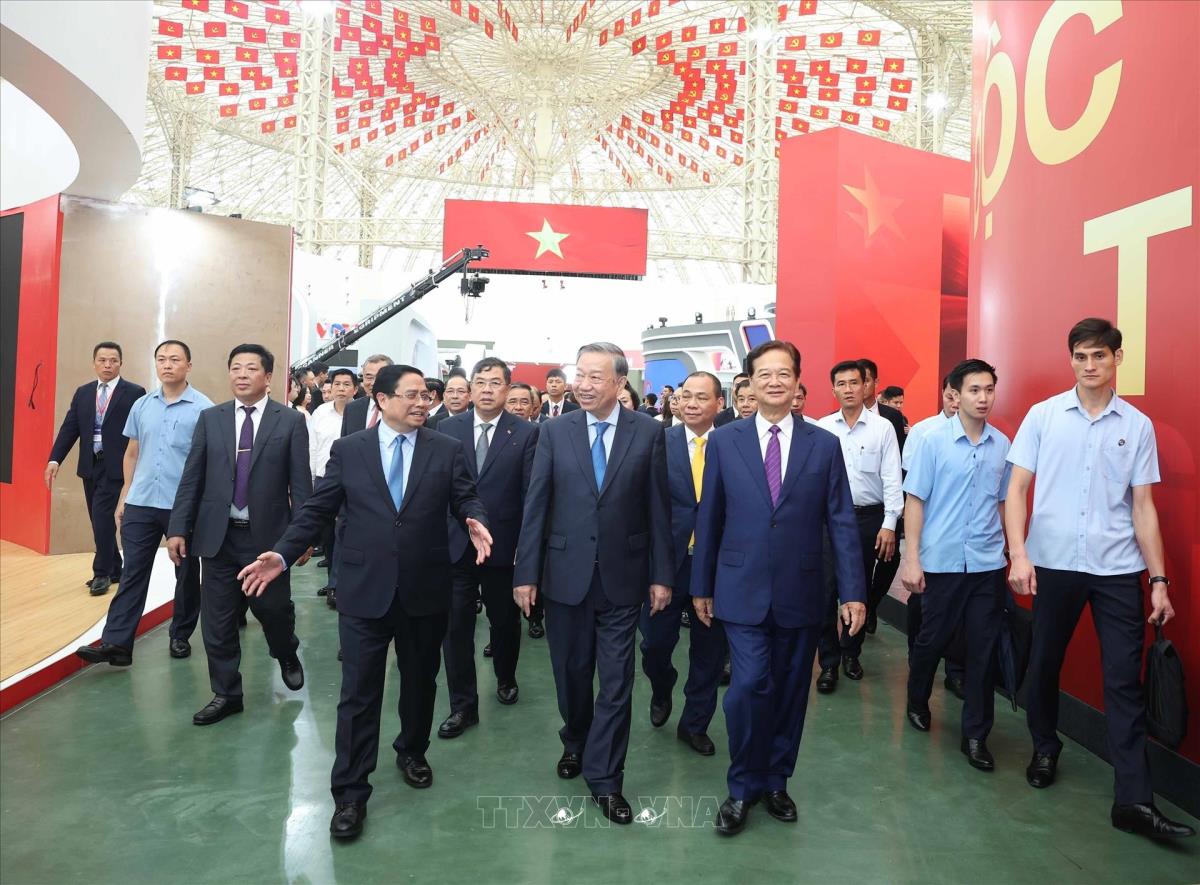 Tổng Bí thư Tô Lâm, Thủ tướng Phạm Minh Chính và các đại biểu tham quan Trung tâm Triển lãm Việt Nam (19/8/2025). Ảnh: Thống Nhất-TTXVN