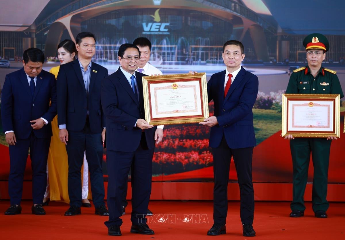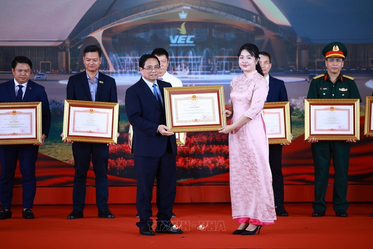 Thủ tướng Phạm Minh Chính trao Bằng khen cho các tập thể và cá nhân có thành tích xuất sắc trong đợt thi đua cao điểm “500 ngày đêm thi công hoàn thành 3000 km đường bộ cao tốc (19/8/2025). Ảnh: Dương Giang-TTXVN