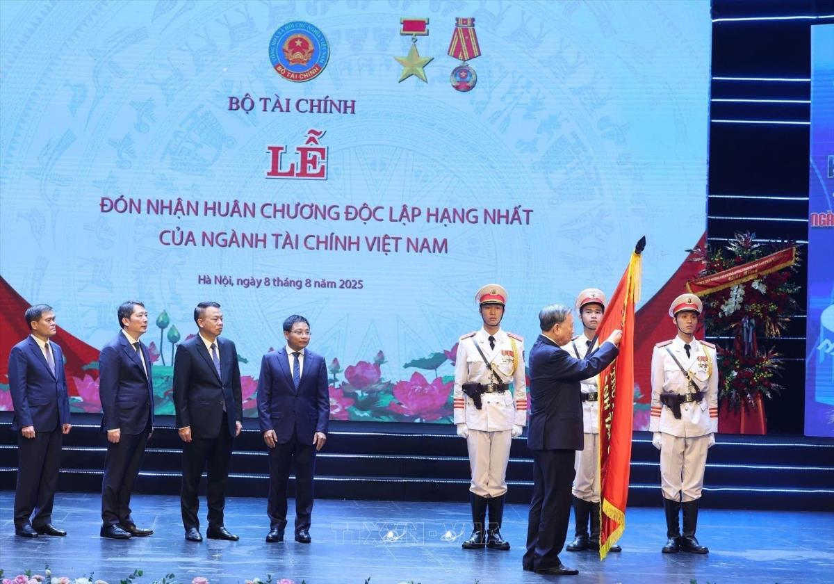 Tổng Bí thư Tô Lâm trao tặng Huân chương Độc lập hạng Nhất cho ngành Tài chính (8/8/2025). Ảnh: Thống Nhất - TTXVN