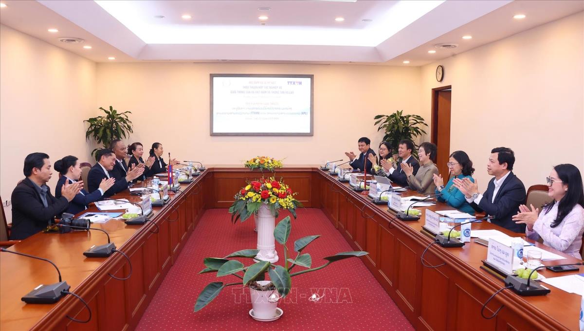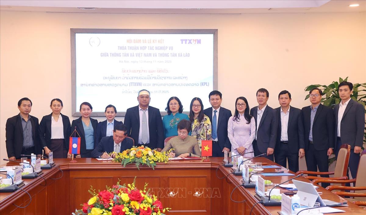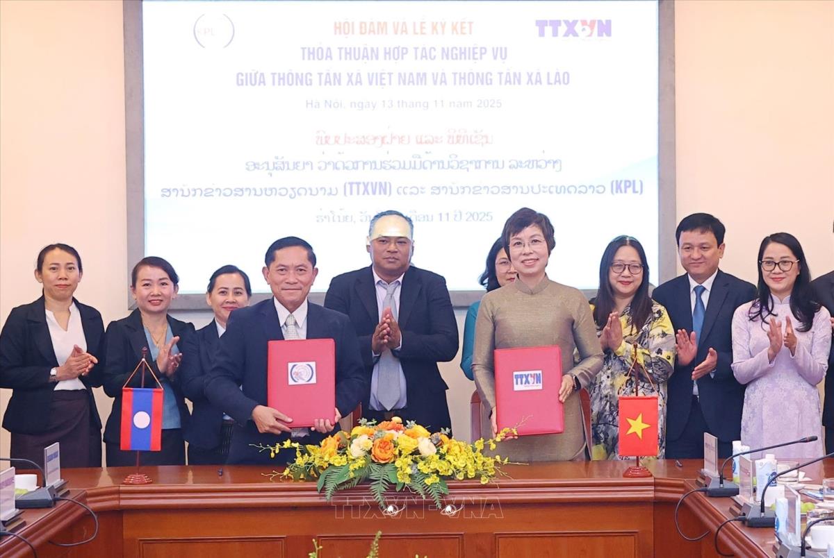 Tổng Giám đốc Thông tấn xã Việt Nam Vũ Việt Trang ký kết thỏa thuận hợp tác nghiệp vụ với Tổng Giám đốc Thông tấn xã Pathet Lào Vannasin Simmavong (13/11/2025). Ảnh: Văn Điệp – TTXVN