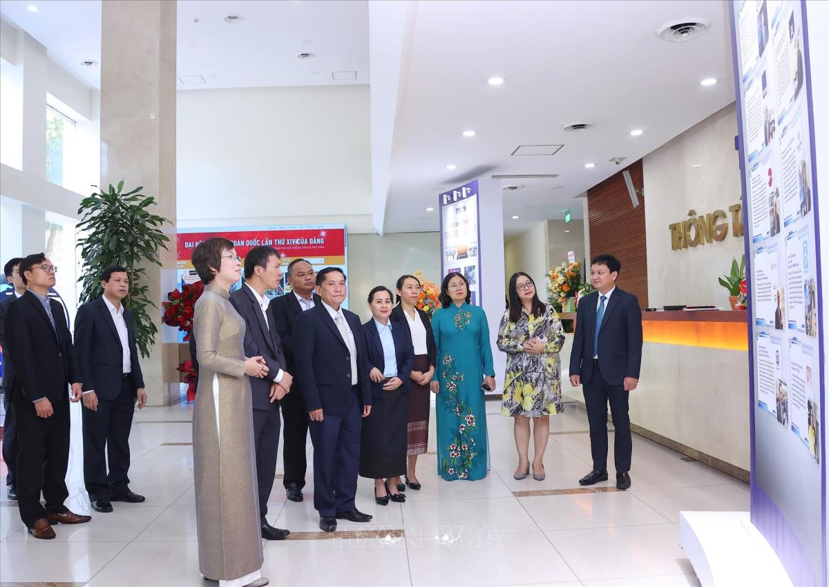 Tổng Giám đốc Thông tấn xã Việt Nam Vũ Việt Trang và Tổng Giám đốc Thông tấn xã Pathet Lào Vannasin Simmavong với các đại biểu tham quan các ấn phẩm điện tử của TTXVN (13/11/2025). Ảnh: Văn Điệp – TTXVN