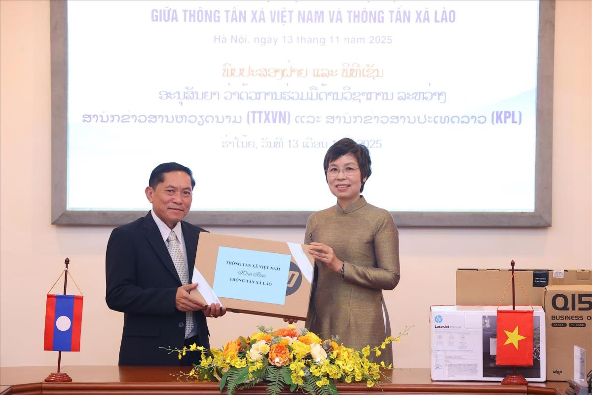 Tổng Giám đốc Thông tấn xã Việt Nam Vũ Việt Trang trao tặng phẩm tặng Thông tấn xã Pathet Lào (13/11/2025). Ảnh: Văn Điệp – TTXVN