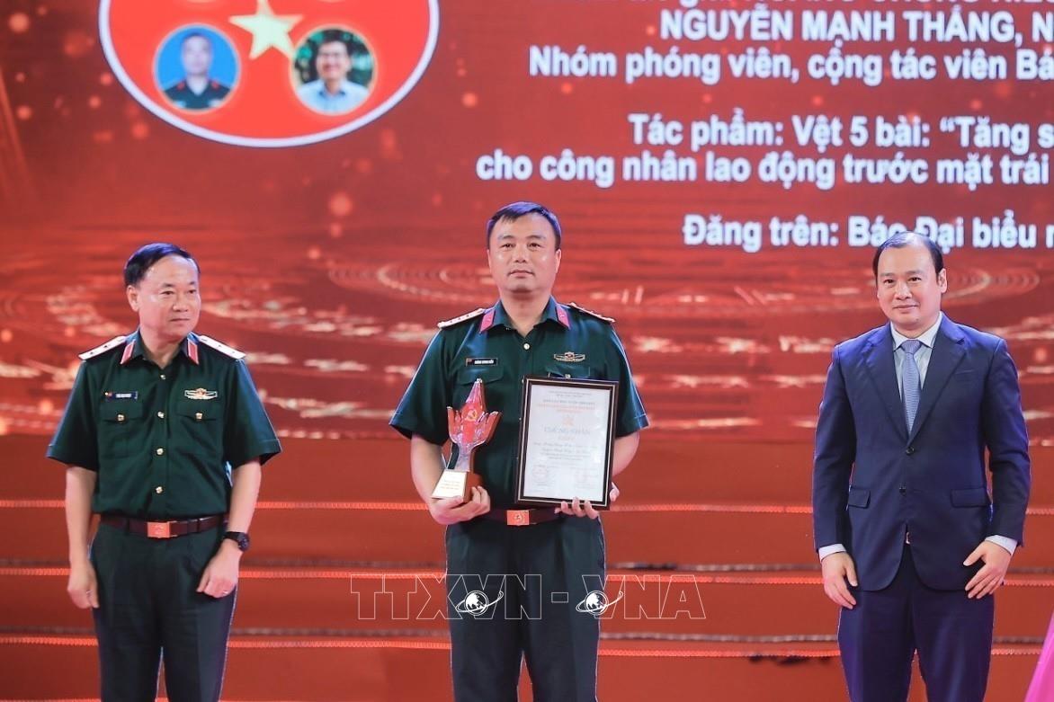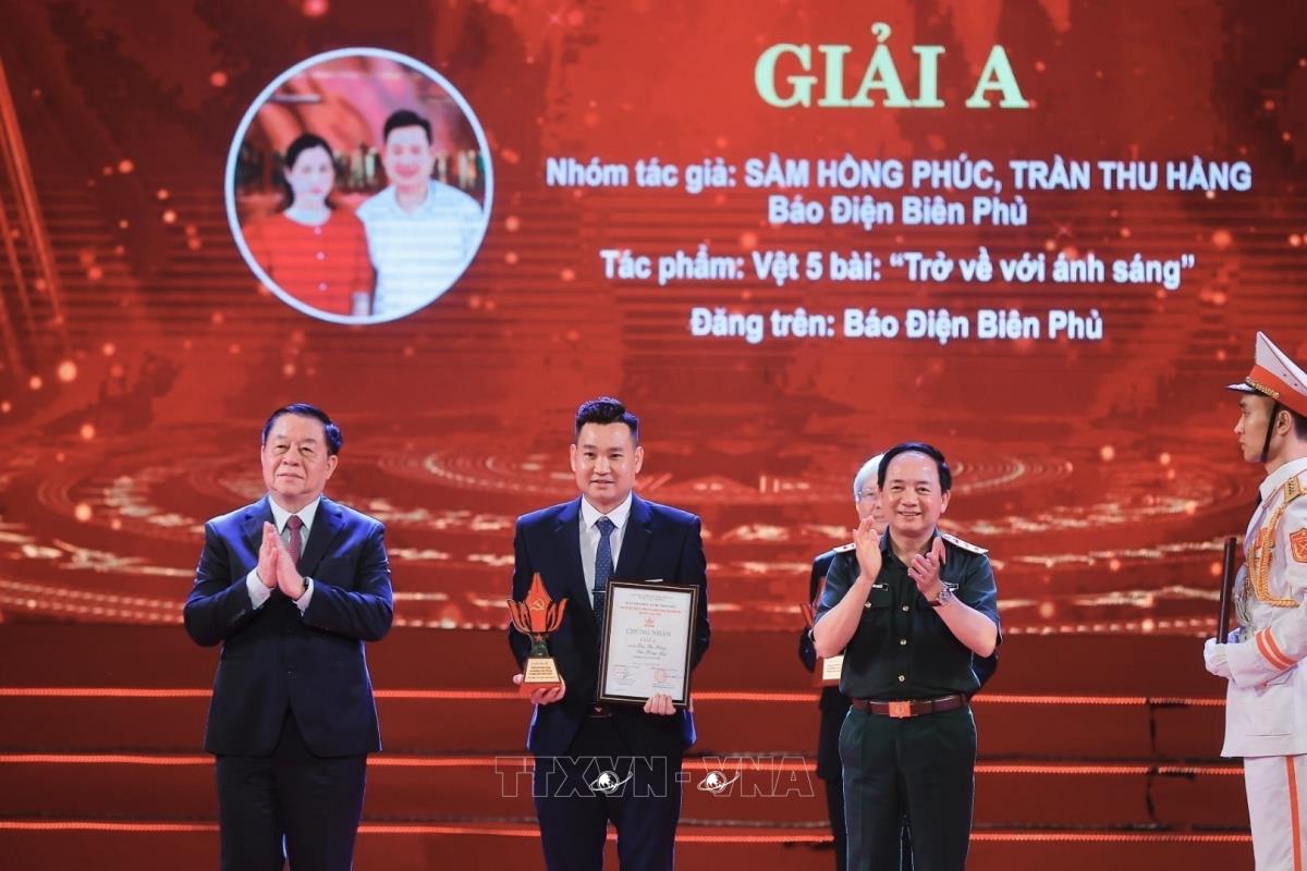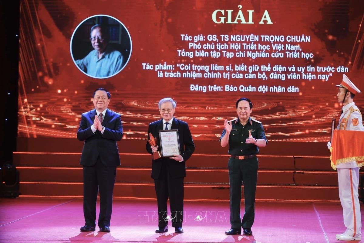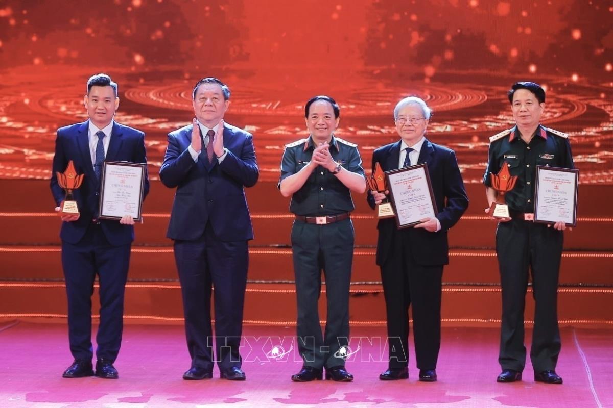 Trưởng Ban Tuyên giáo và Dân vận Trung ương Nguyễn Trọng Nghĩa và Thượng tướng Trịnh Văn Quyết, Chủ nhiệm Tổng cục Chính trị Quân đội nhân dân Việt Nam trao giải A cho các tác giả đoạt giải (15/5/2025). Ảnh: Minh Quyết - TTXVN